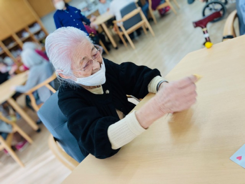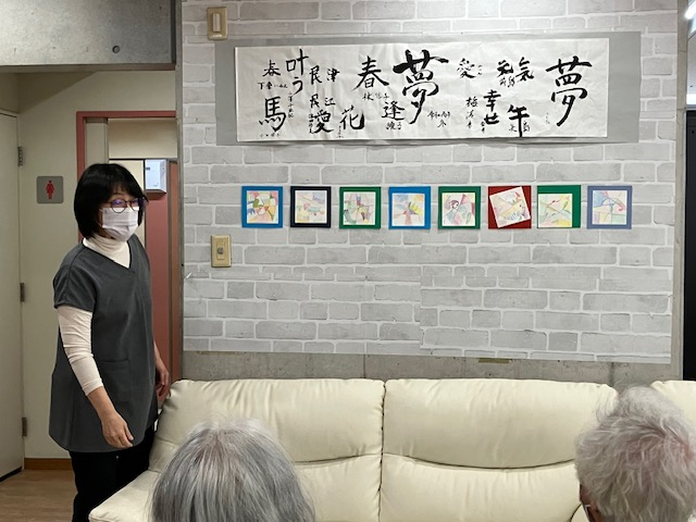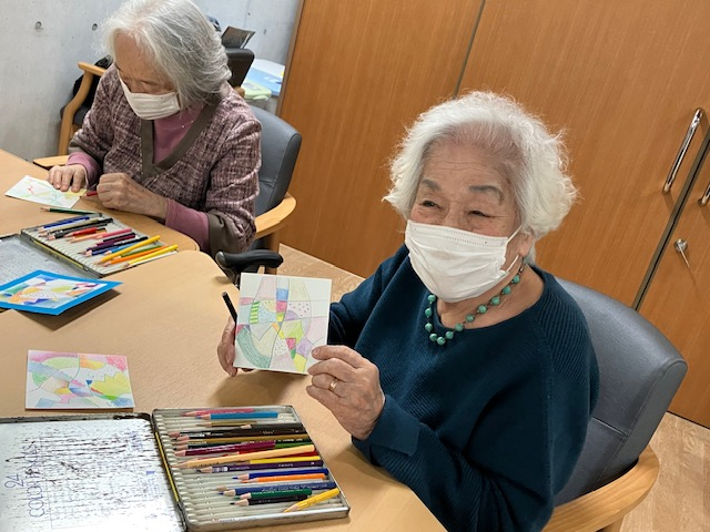テーブルでお仲間と脳トレチームと臨床美術チームに分かれ楽しまれました。