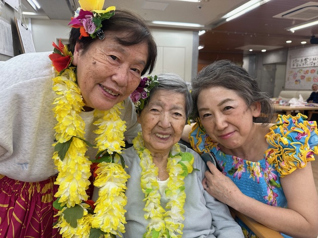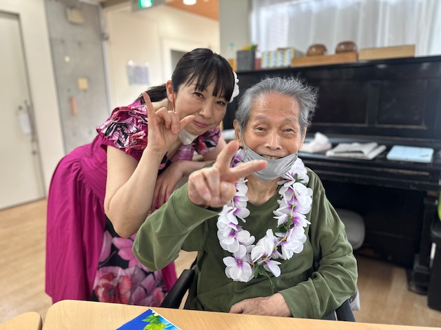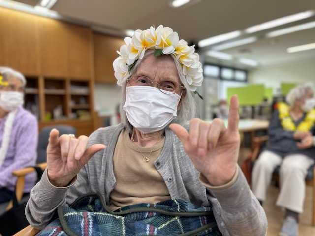 職員もご利用者様も色とりどりの衣装に身を包み、首にはレイ(花の首飾り)