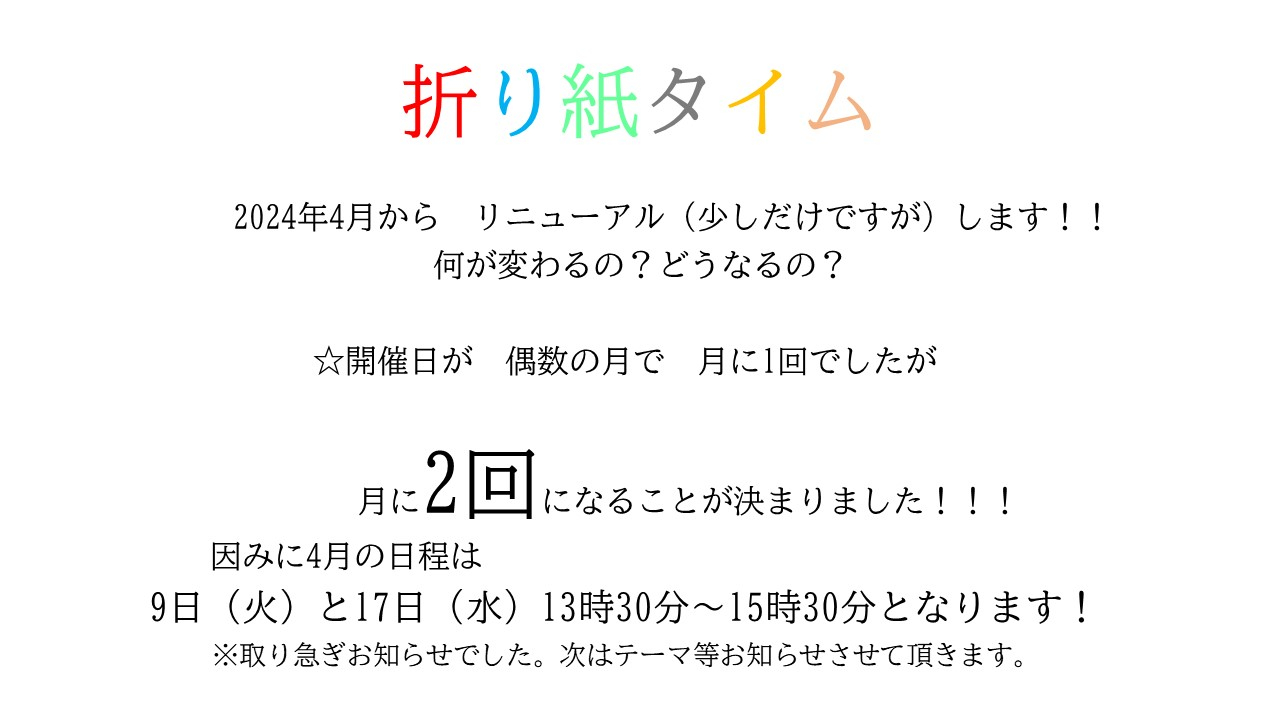 2024.03.15 お知らせ 折り紙タイム 2024年 4月~ Tweet シェアする 前の記事 2024.04.20 お知らせ スマートフォン講座 次の記事 2023.12.18 お知らせ 第一回戸山シニア活動館利用者懇談会 一覧へ戻る