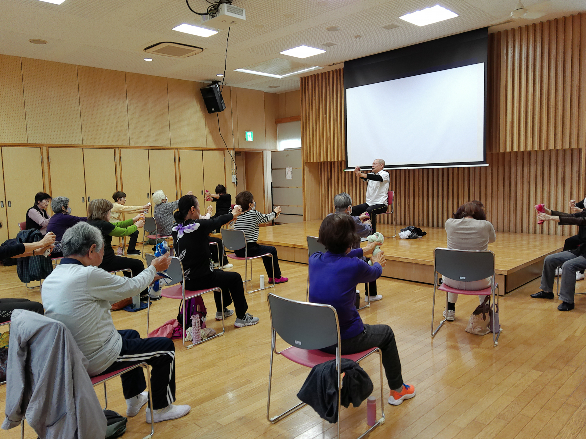 本日の参加者様は前半、後半合わせて70名の皆様がイキイキ体操のメロデイーに合わせて、上半身、下半身を動かしていました。タオルを使用してストレッチ運動を行っているところです。