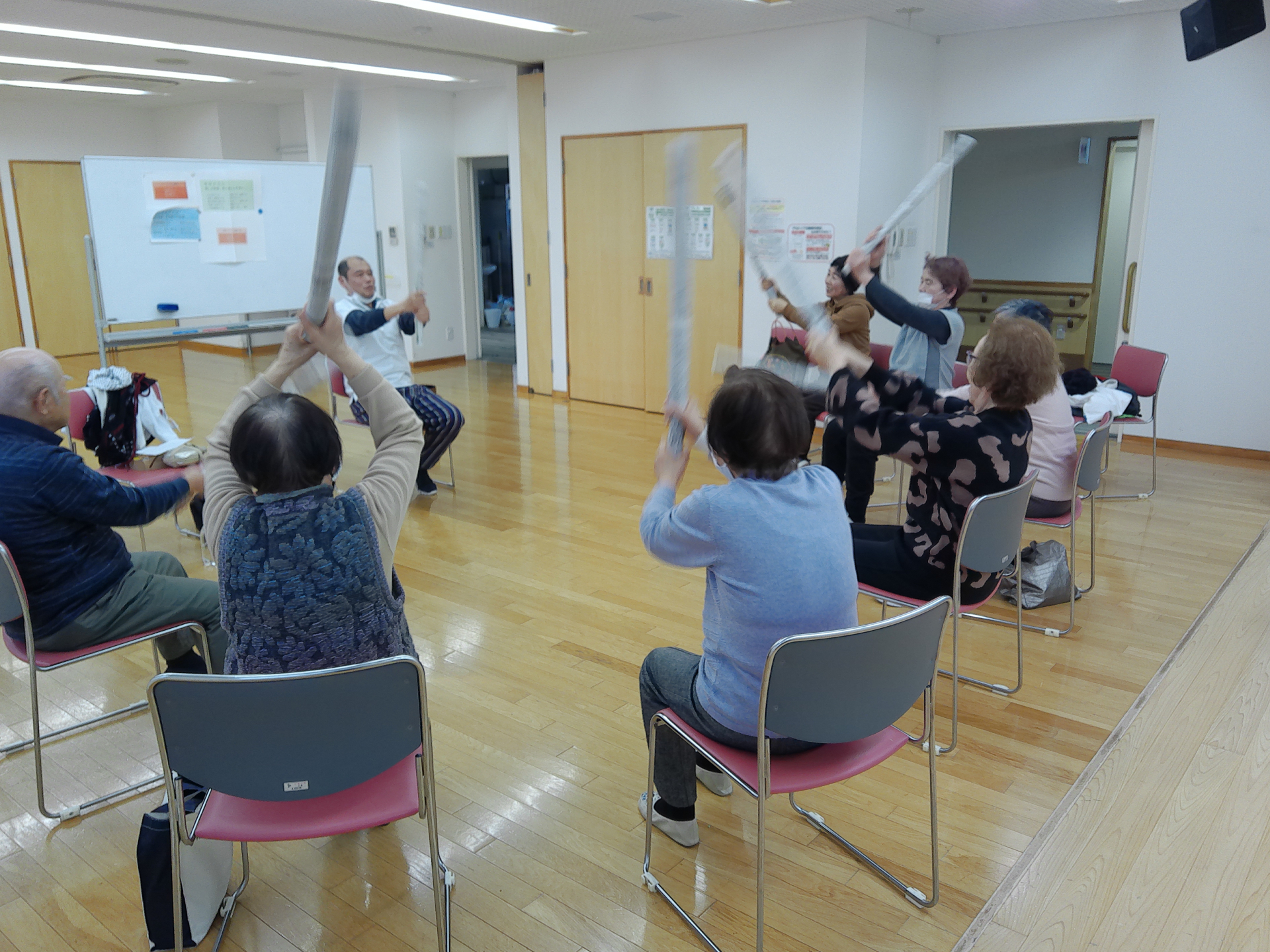 本日4回目を数えました。ペットボトル500mlをダンベルの代わりにして、前後、左右、上下に、動かし、手首、肘、肩周りの関節を動かして筋肉に軽い刺激を加えて頂きました。その後は、頭の体操では棒体操を上から落として素早くキャッチを行いました。写真は素早くキャッチ行うところです。ゲーム感覚を取り入れて楽しく行います。ラクラク健康増進活動はまだ始まったばかりで、皆さんの意見を取り入れながら作って参りたいと思います。宜しくお願いします。及川