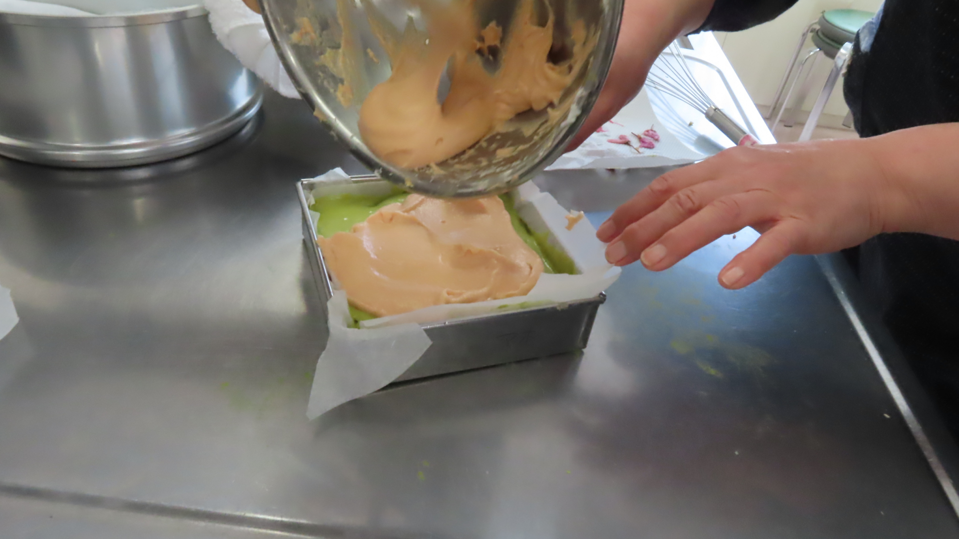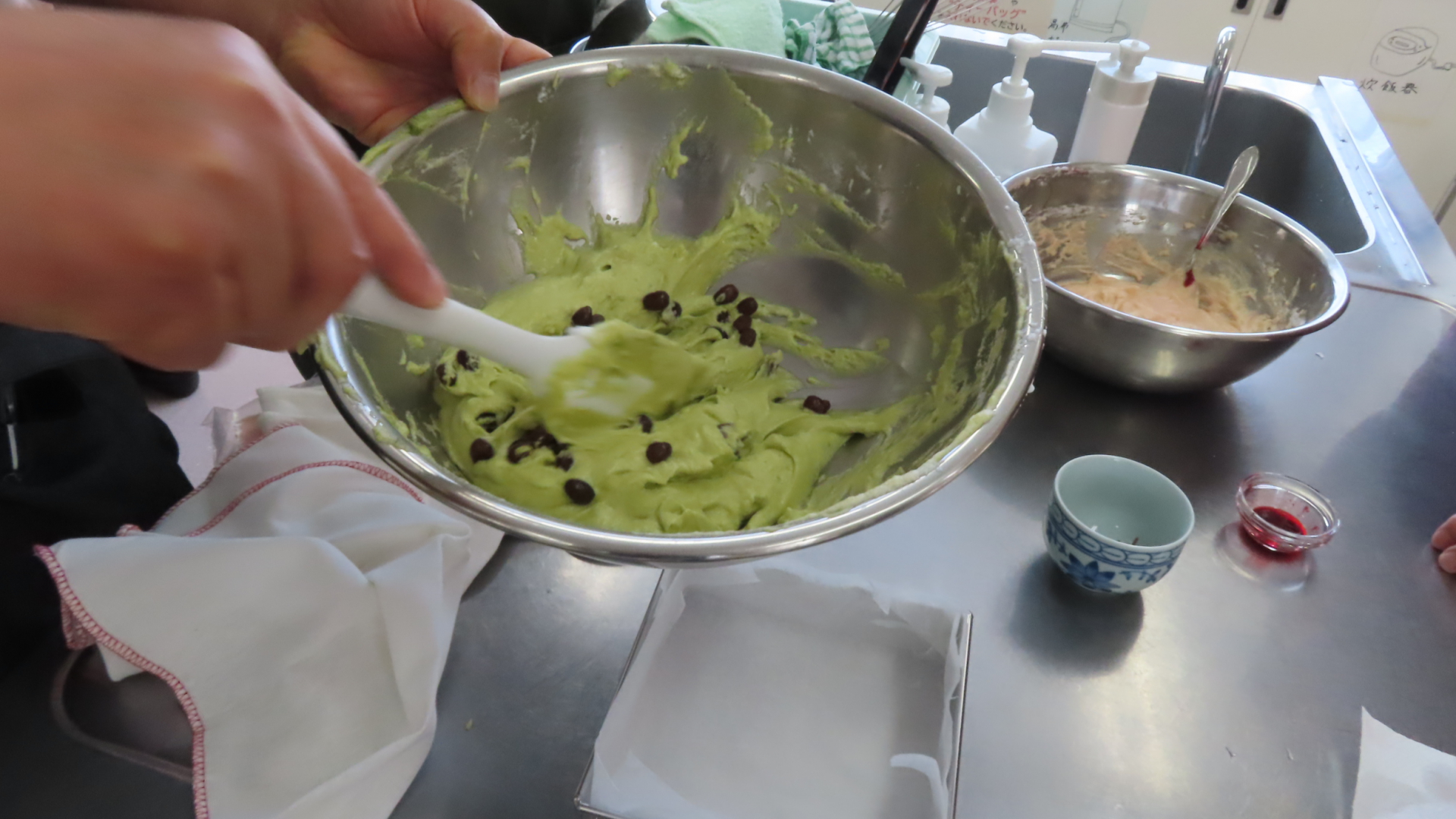 卵・白玉粉・砂糖に食紅と抹茶を混ぜた2色の生地を作ったら、