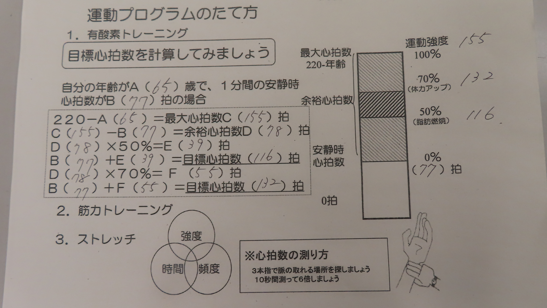 そして運動プログラムの立て方(目標心拍数の計算)やインターバル体操、屋内ウオーキングを行いました。