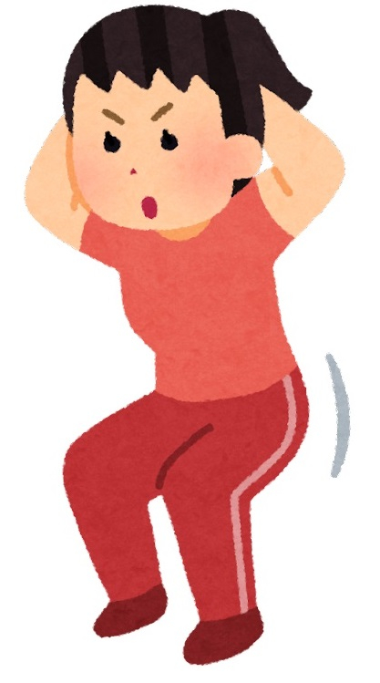 スクワット20秒~(10秒休憩)~ジャンプ20秒~(10秒休憩)~足踏み20秒~(10秒休憩)~ツイスト20秒~(10秒休憩)