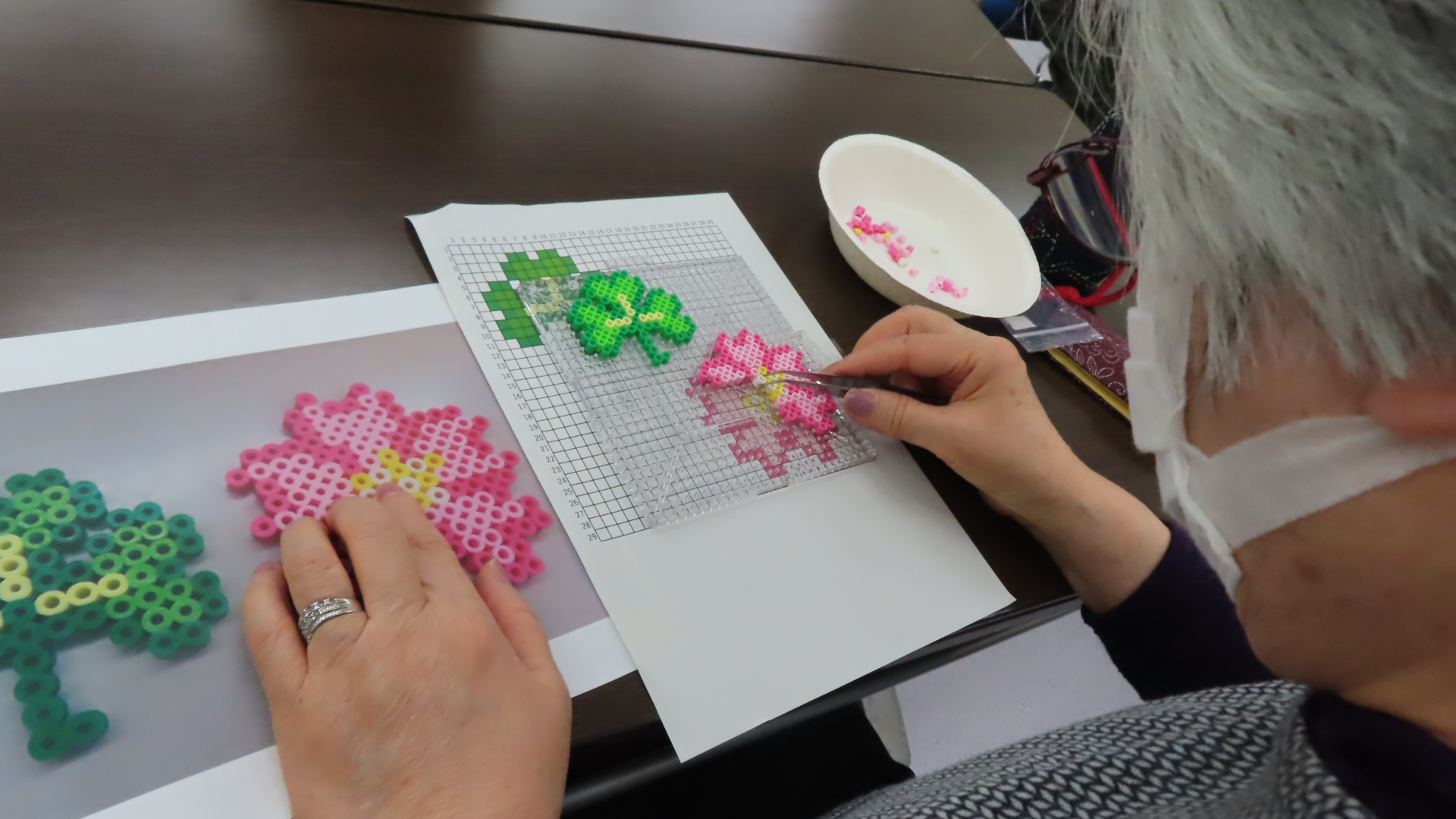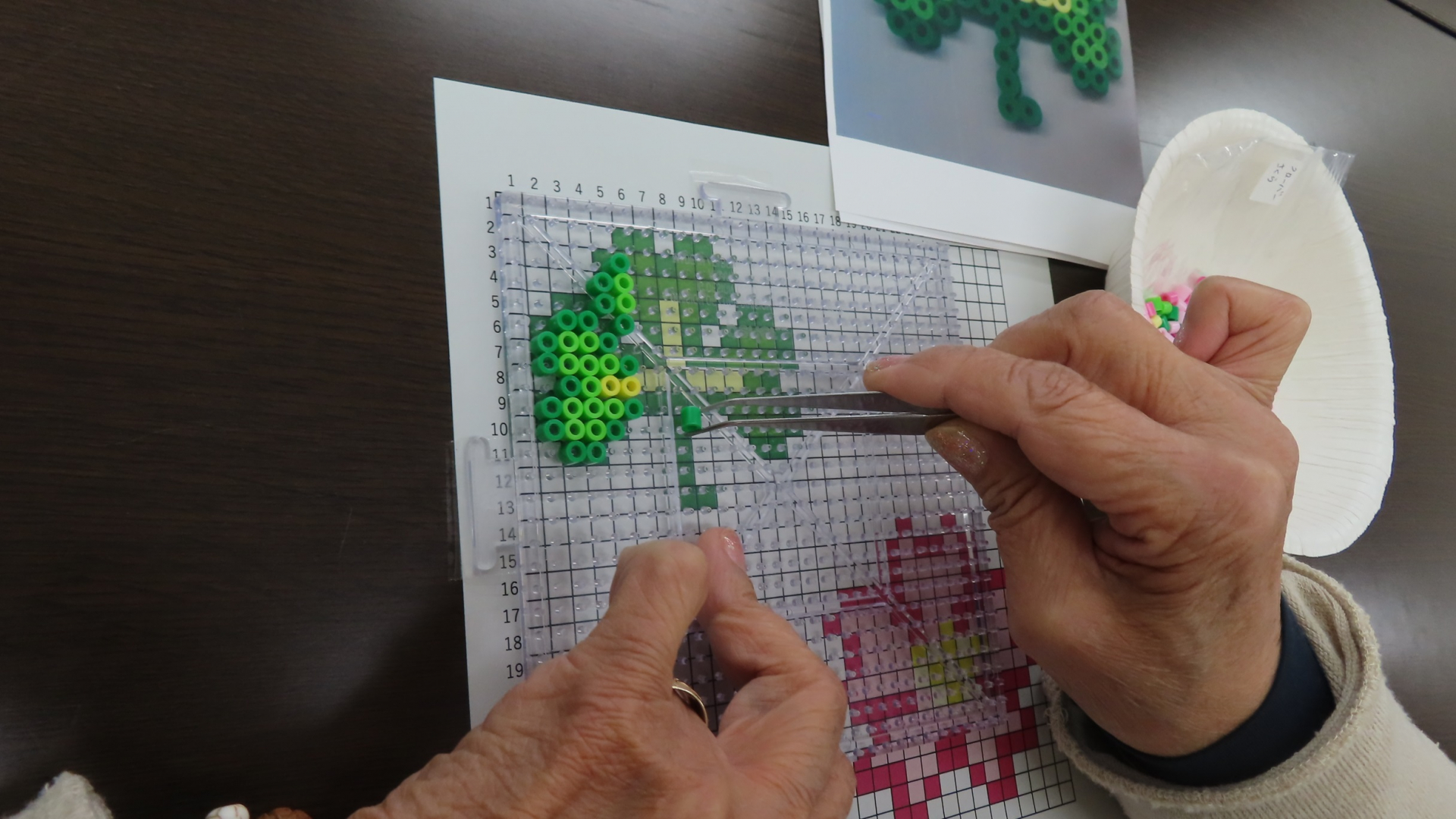 初めてアイロンビーズを触る方も多く、初めは説明を聞きながらマス目に合わせて土台を置き