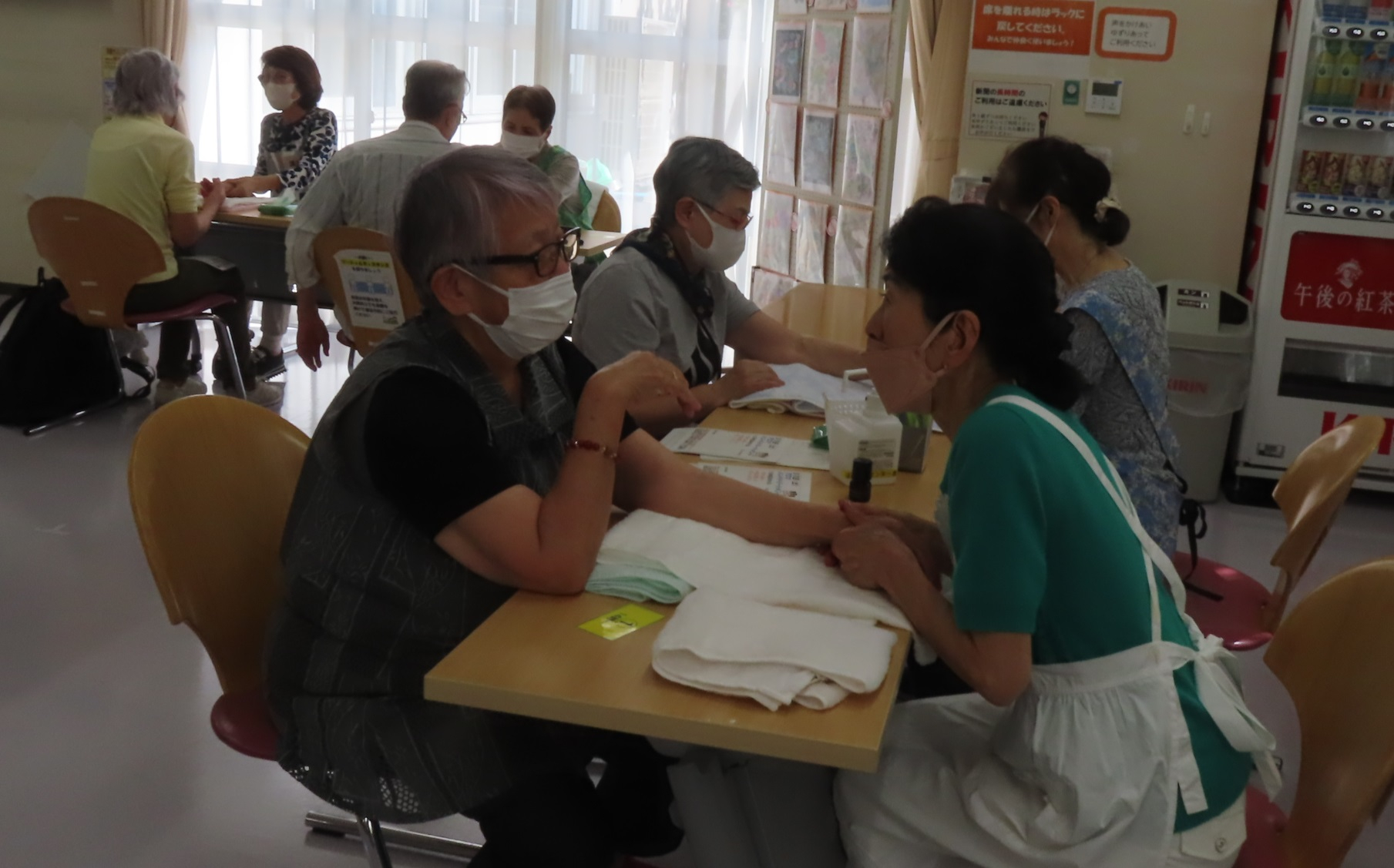 交流サロンでは、実際の施術を横目で見ながら、練習が進みます。