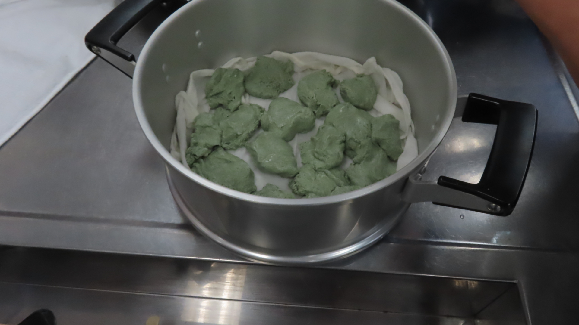 よく混ぜたら蒸し器にちぎって並べ、強火で一気に蒸し上げます。