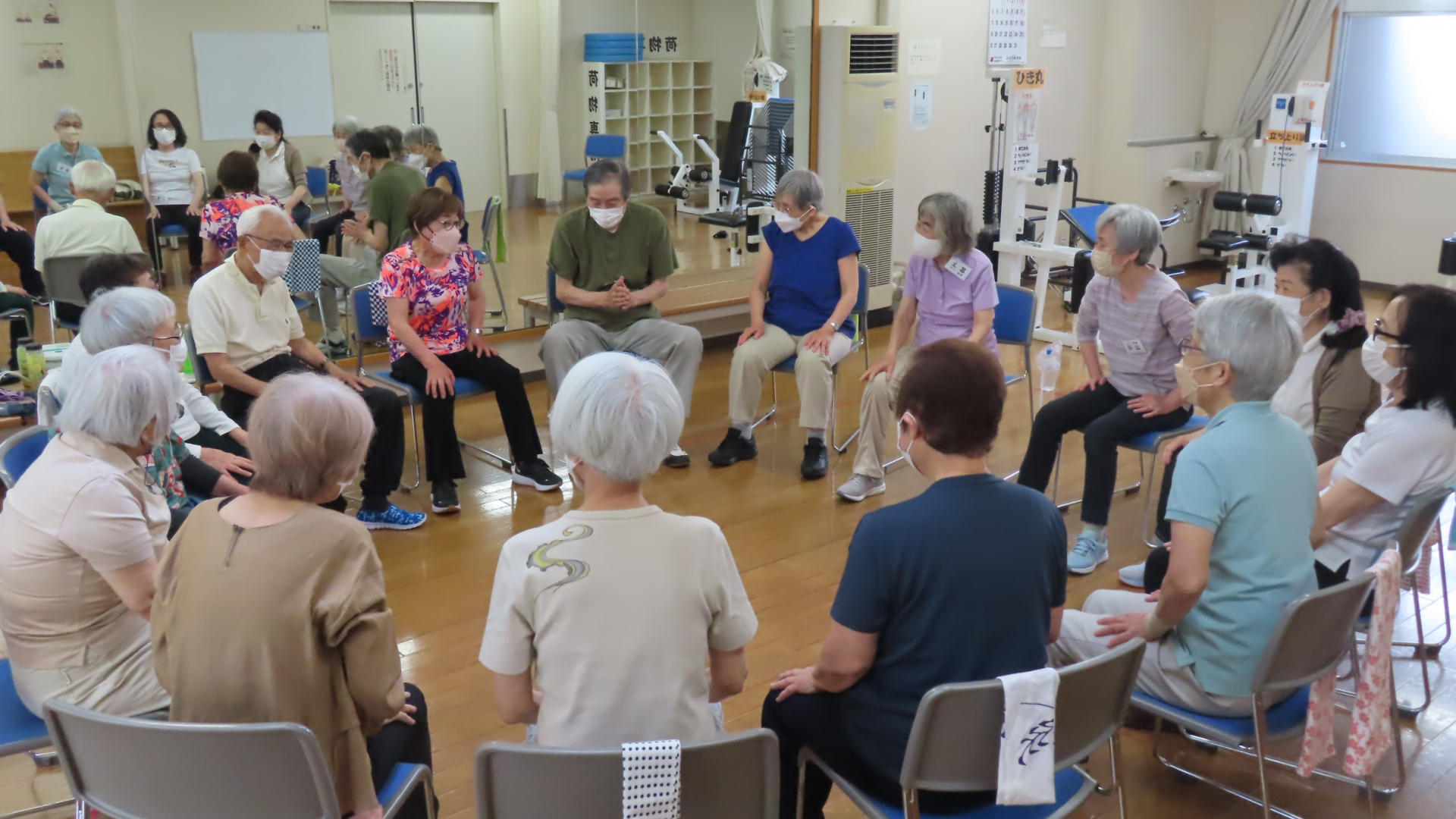 本日も楽しくゆっくり ストレッチ体操の後は輪になって唱歌を歌いながらの脳トレ体操が始まりました。湯川先生の笑いを誘う声かけに皆さん夢中になって体を動かしてしまいます(^^♪