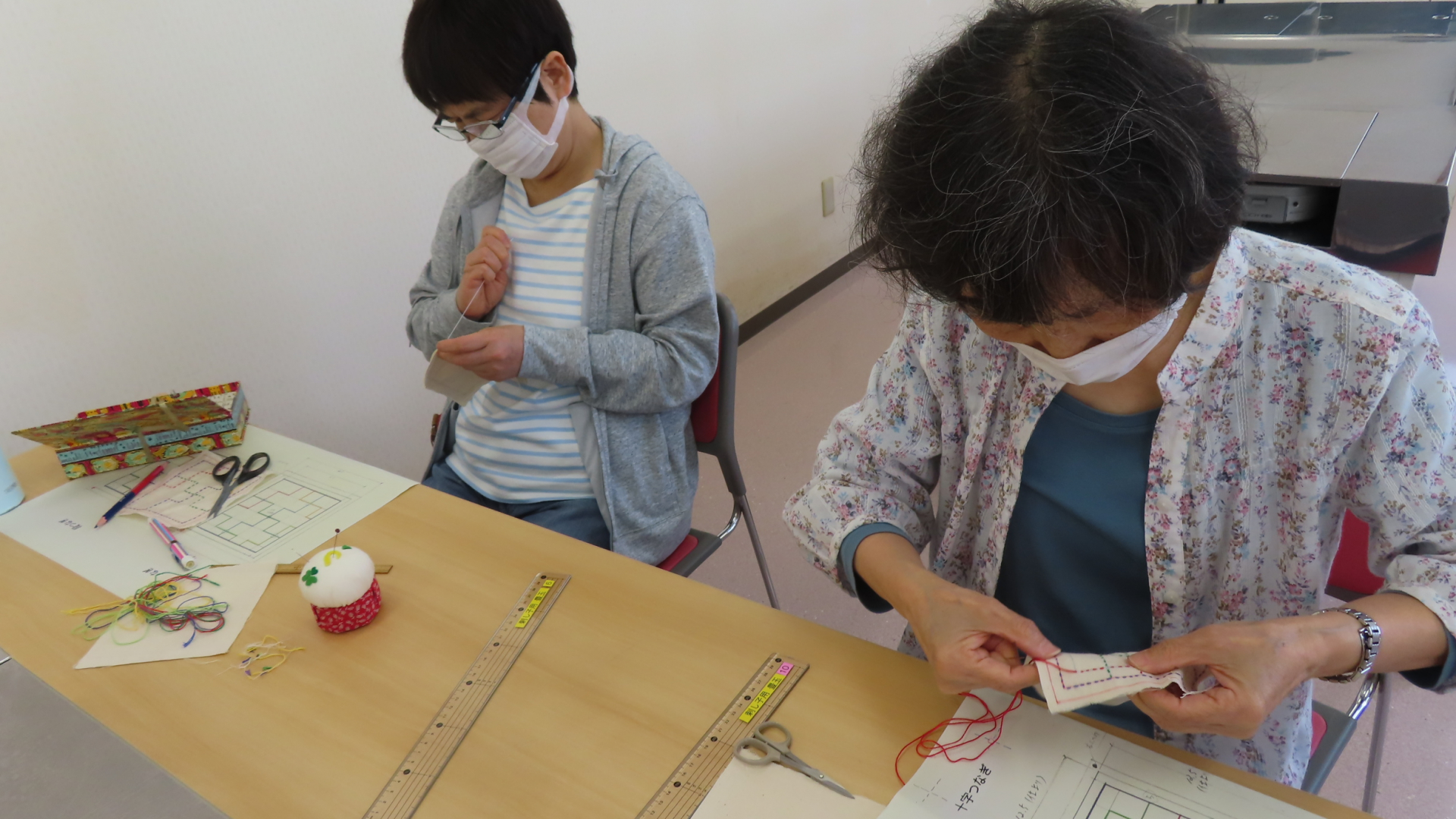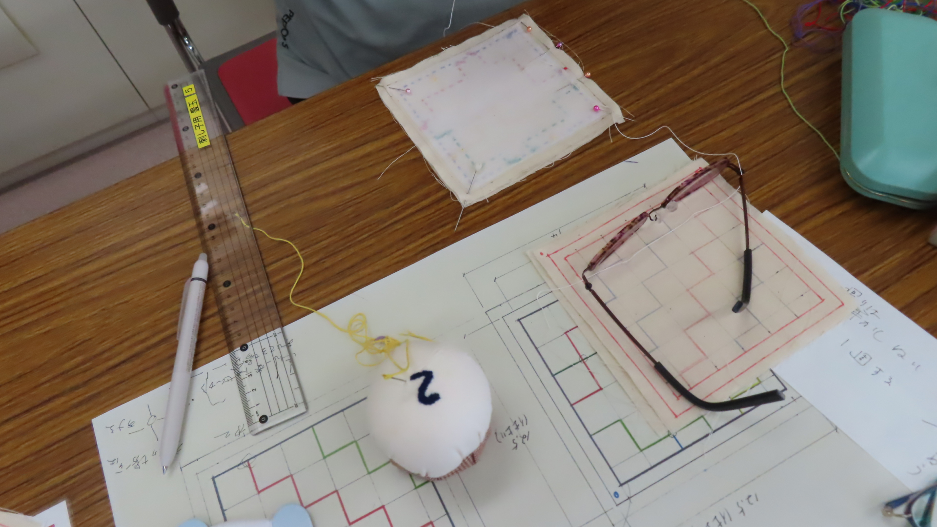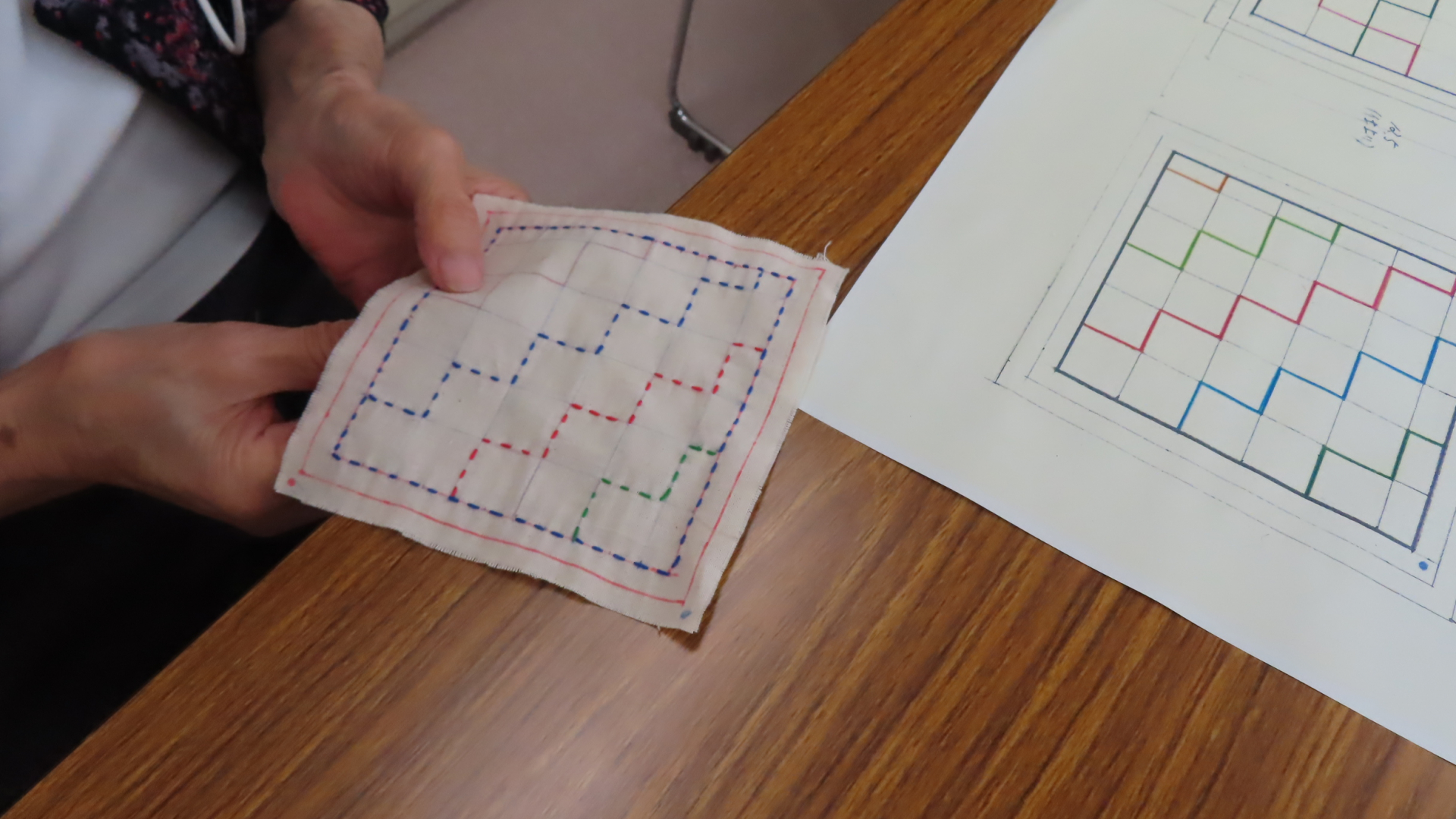 「去年から待っていたのよ」とお待たせした”初めての刺子教室”の開催です。まずは直線縫いの段つなぎと十字繋ぎに挑戦して頂きます。一升が2cmとかなり大きく縫いやすいように致しました。