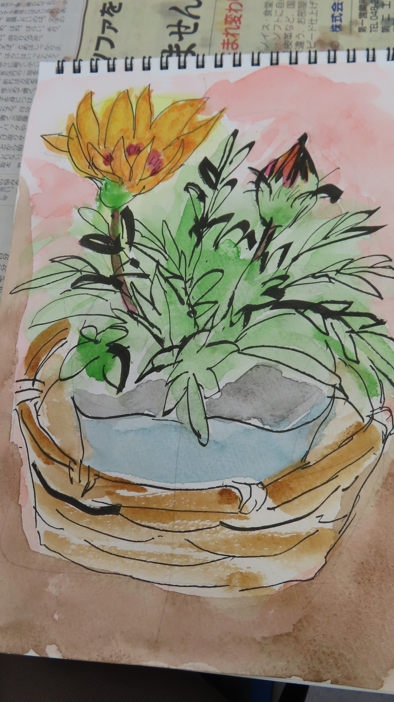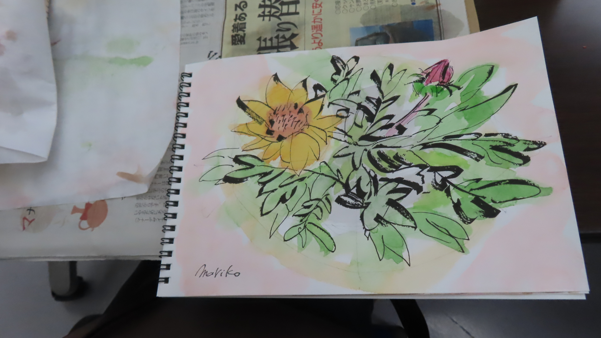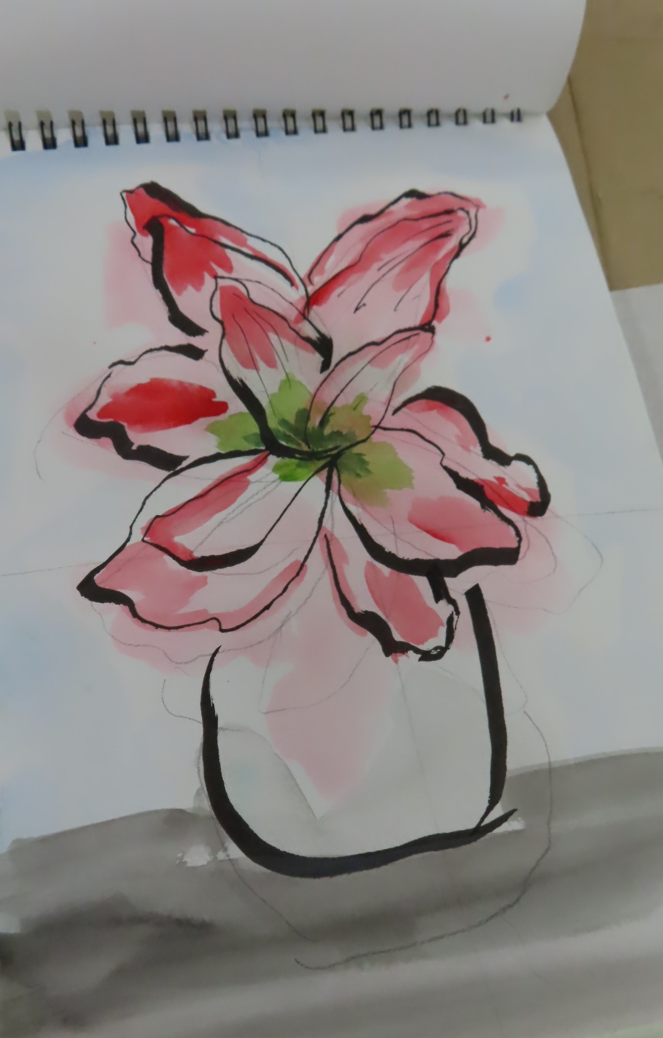 まずは気に入った花の前に座り構想を練ります。スケッチブックに中心線を薄く引き、花や葉、入れ物などの構図を大体決めて、次に水彩絵の具で大きく薄めに色を置いて行きます。 紙が乾いたらカリグラフィーペンで輪郭線をペンの強弱をつけ思い切って描いて行きます。