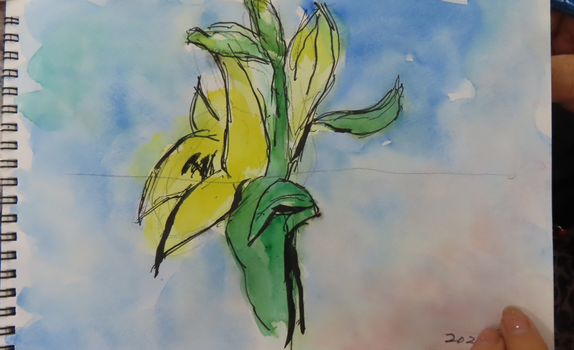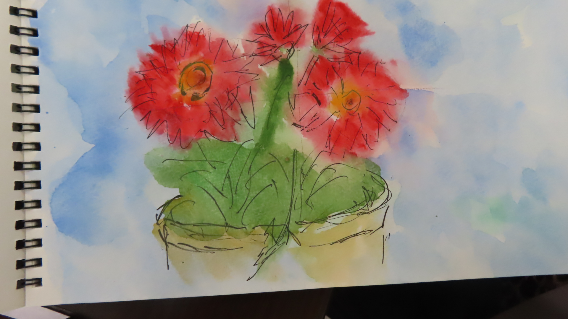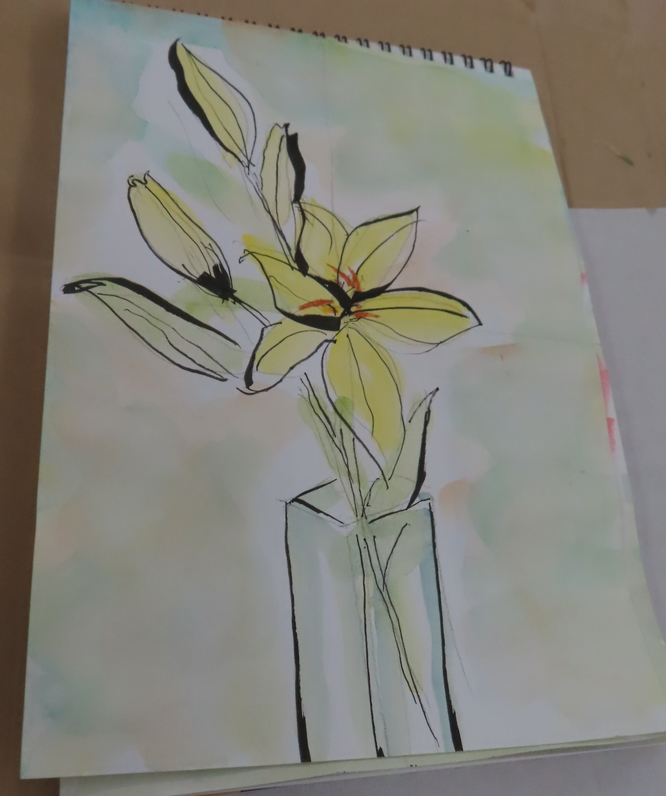 まずは気に入った花の前に座り構想を練ります。スケッチブックに中心線を薄く引き、花や葉、入れ物などの構図を大体決めて、次に水彩絵の具で大きく薄めに色を置いて行きます。 紙が乾いたらカリグラフィーペンで輪郭線をペンの強弱をつけ思い切って描いて行きます。