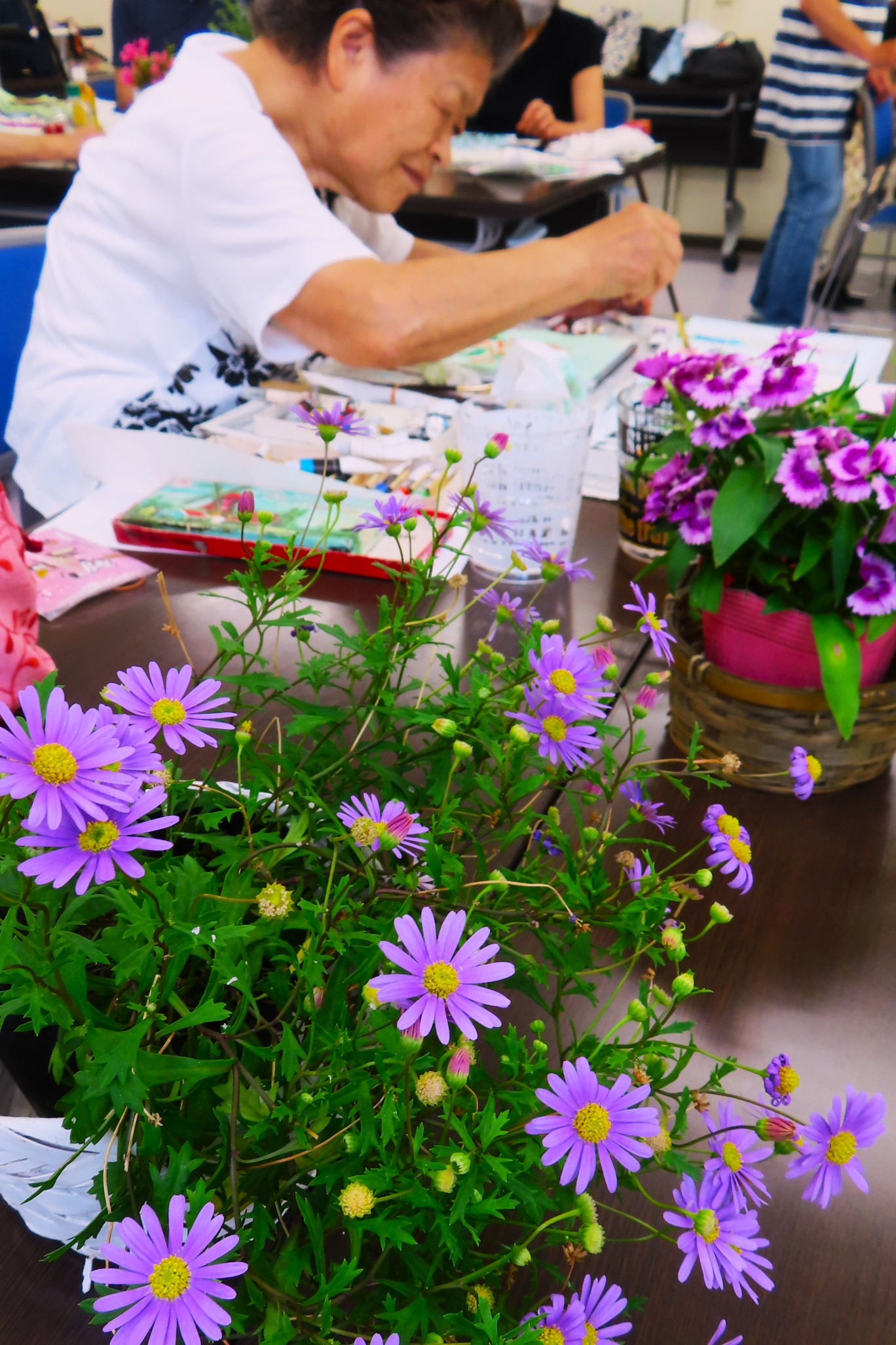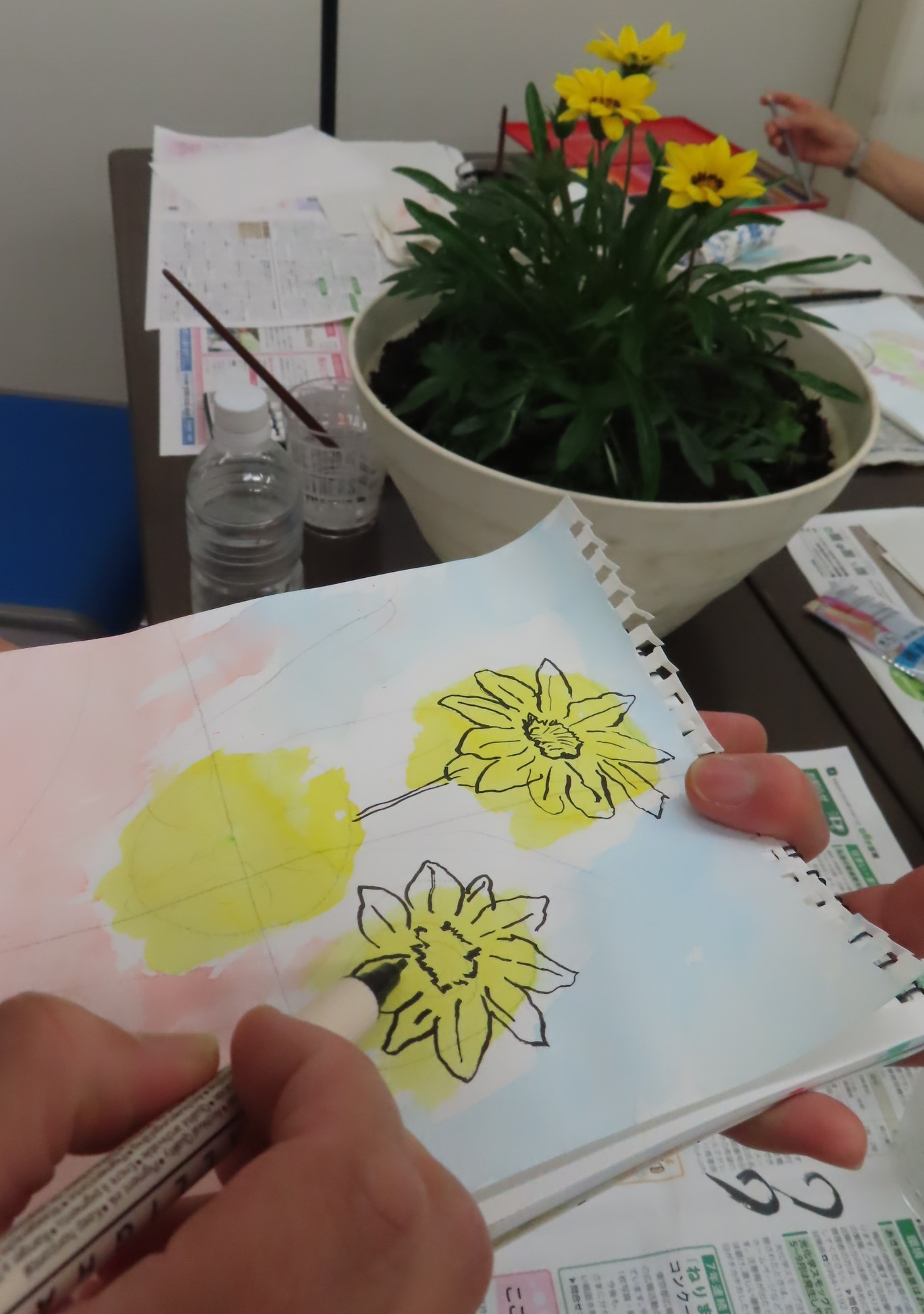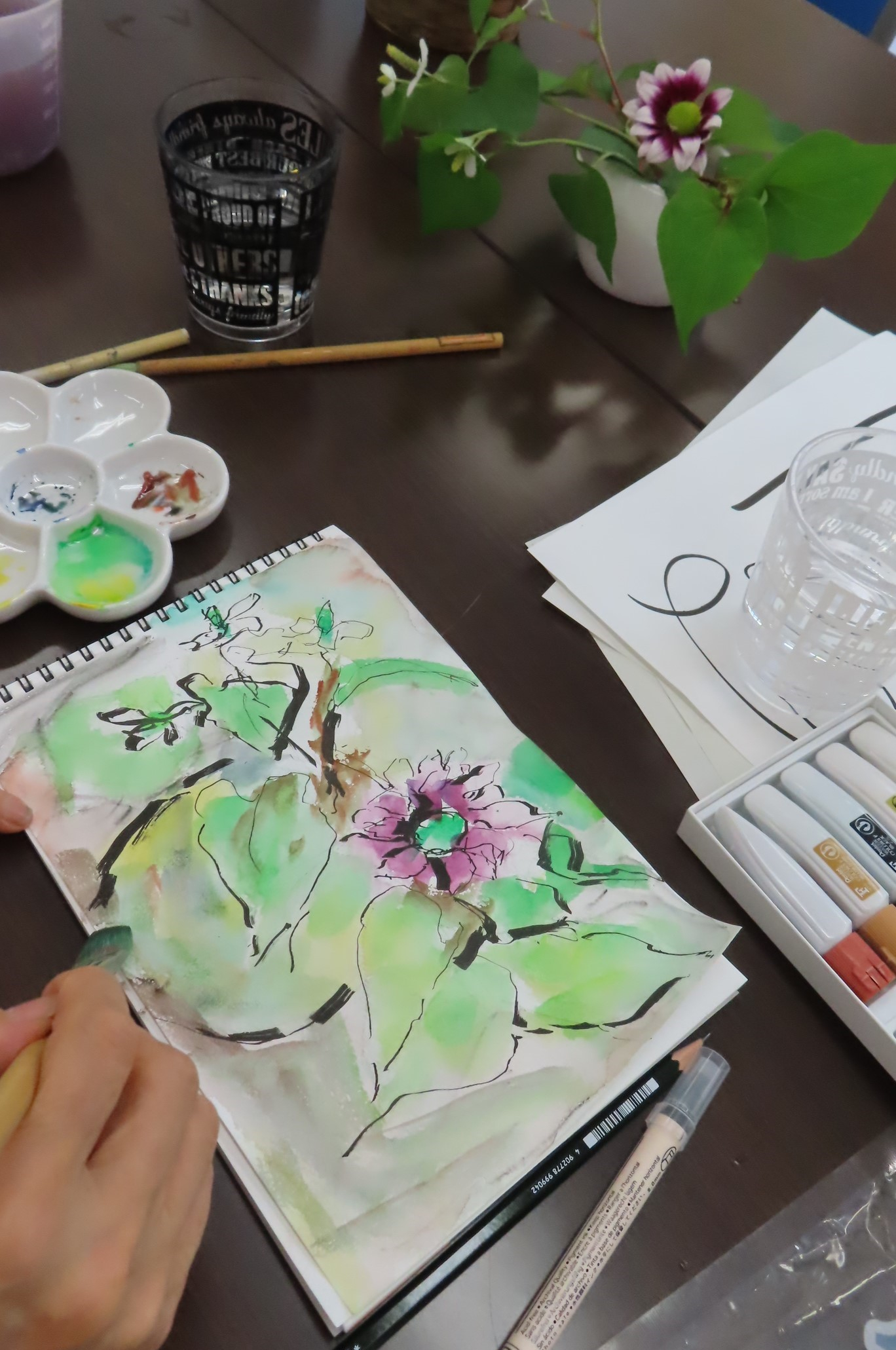 皆さま、「ほかのテーブルの違う花も描きたいわ」と言われ、水彩絵の具とカリグラフィーペンを自由に使いこなされていました。