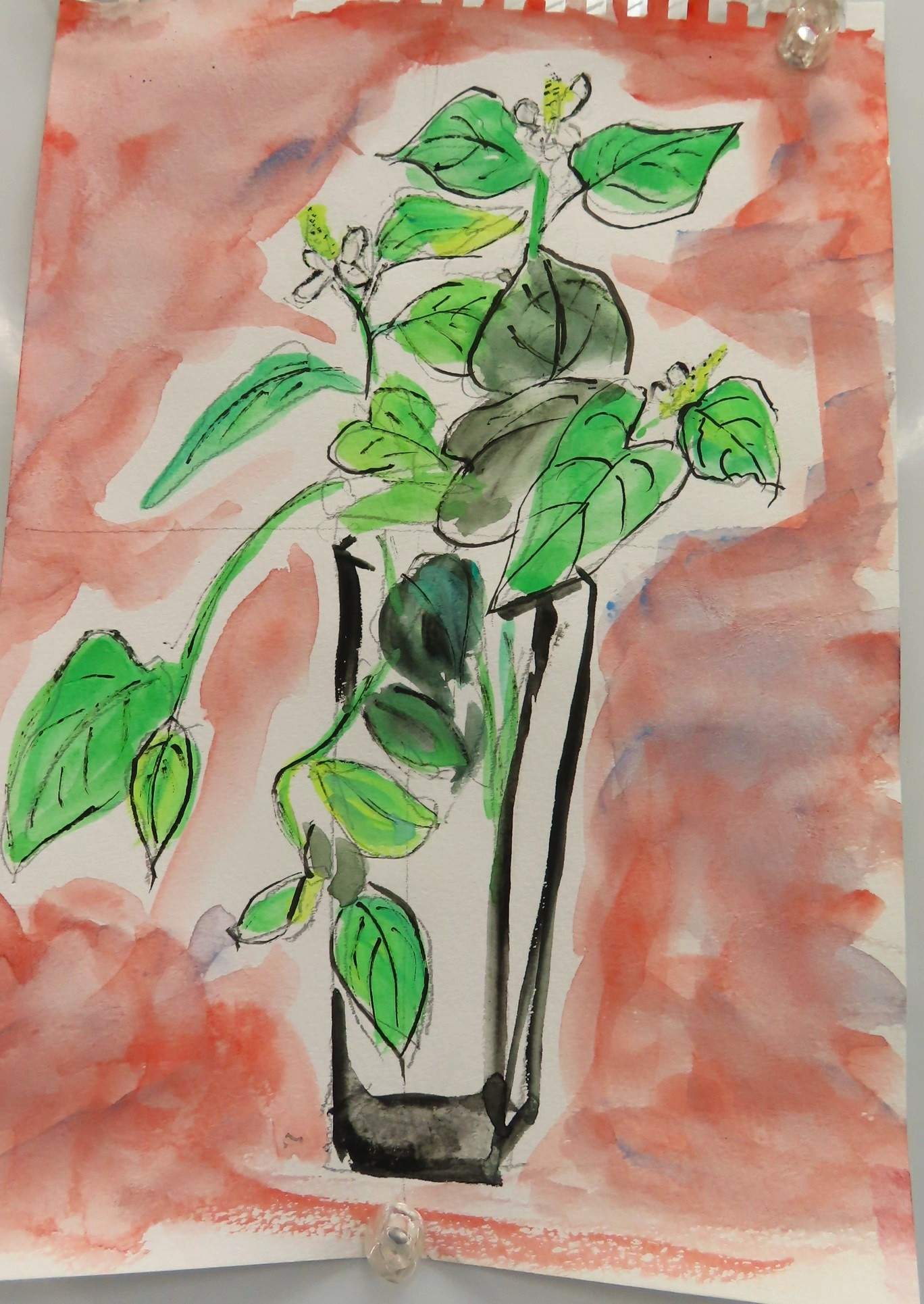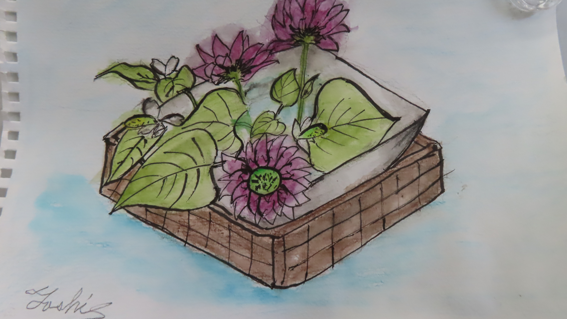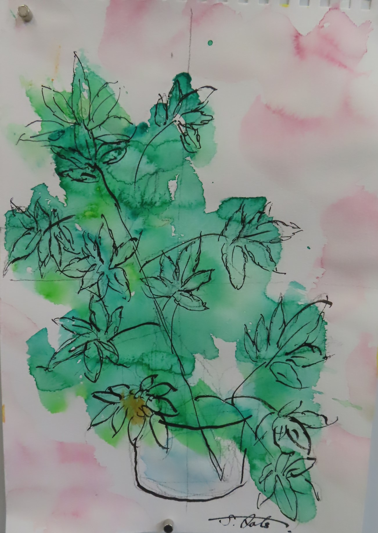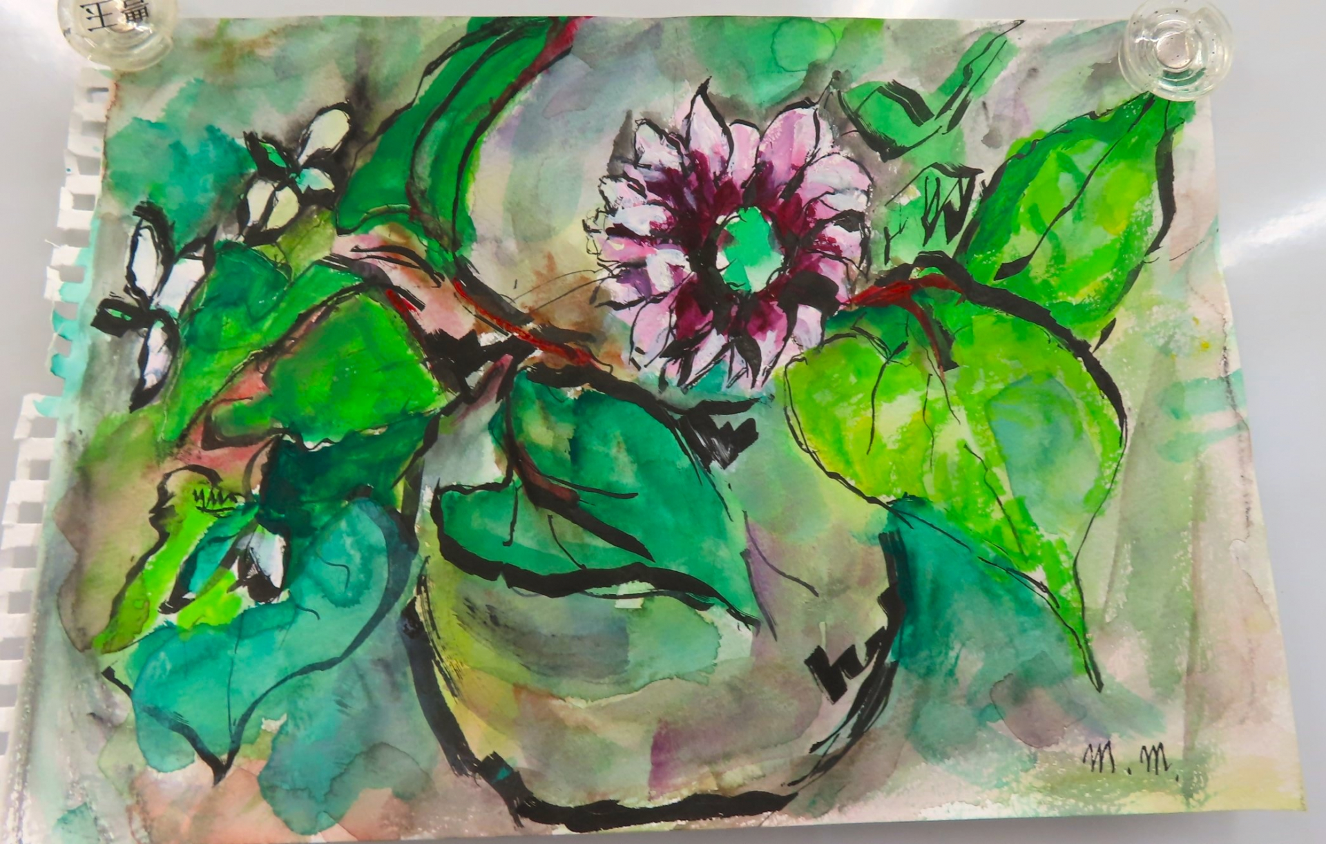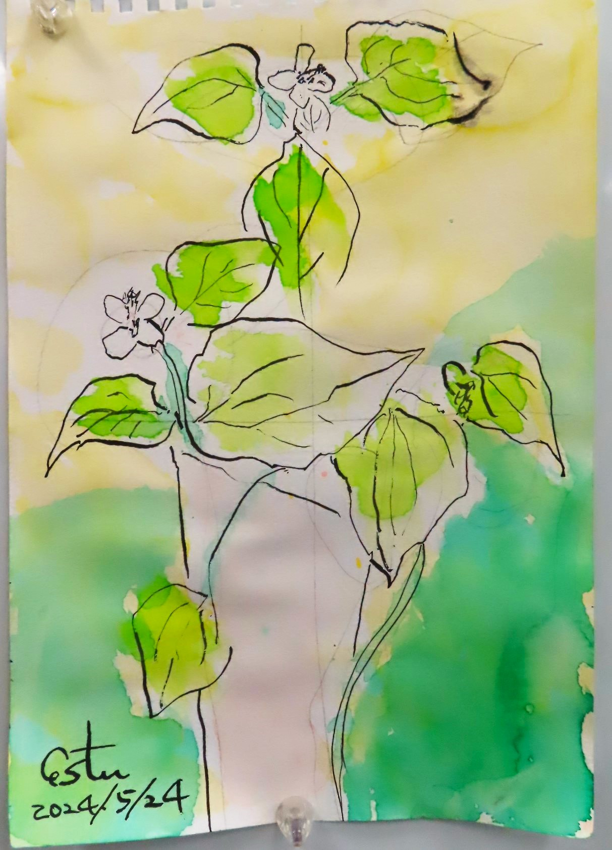 ↓「カリグラフィーペンのペン先が乾いてしまって」と苦戦されていましたが花瓶の線が質感や立体感を感じさせ、繊細なドクダミの花や葉と対象的で詩的な雰囲気ですね
