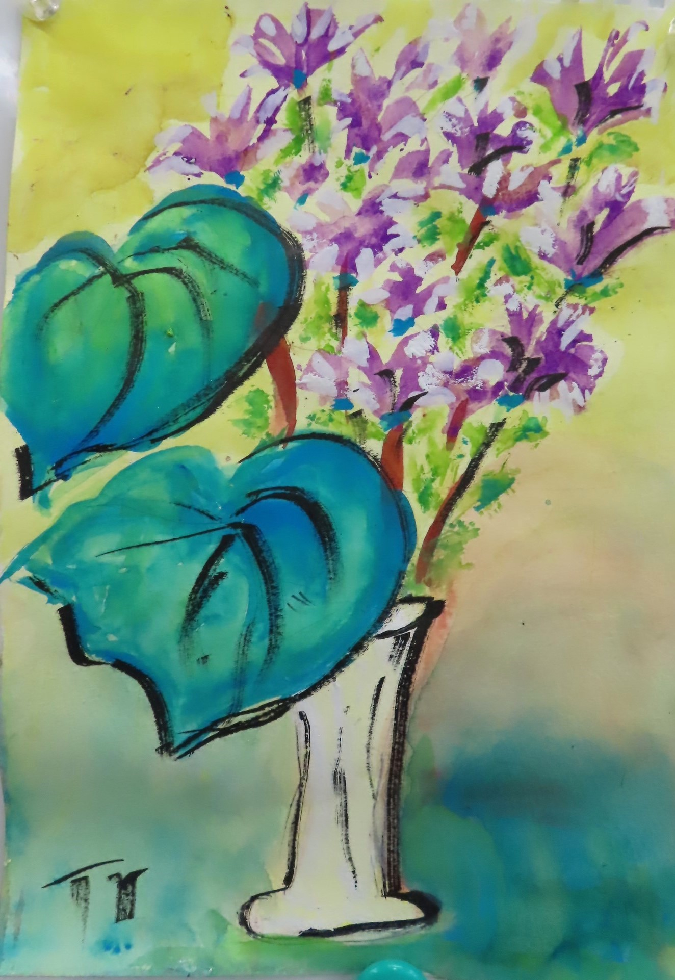 ↓花の紫と葉の緑青にバックのクリーム色が調和したセンスある作品です。白の使い方もお上手です。