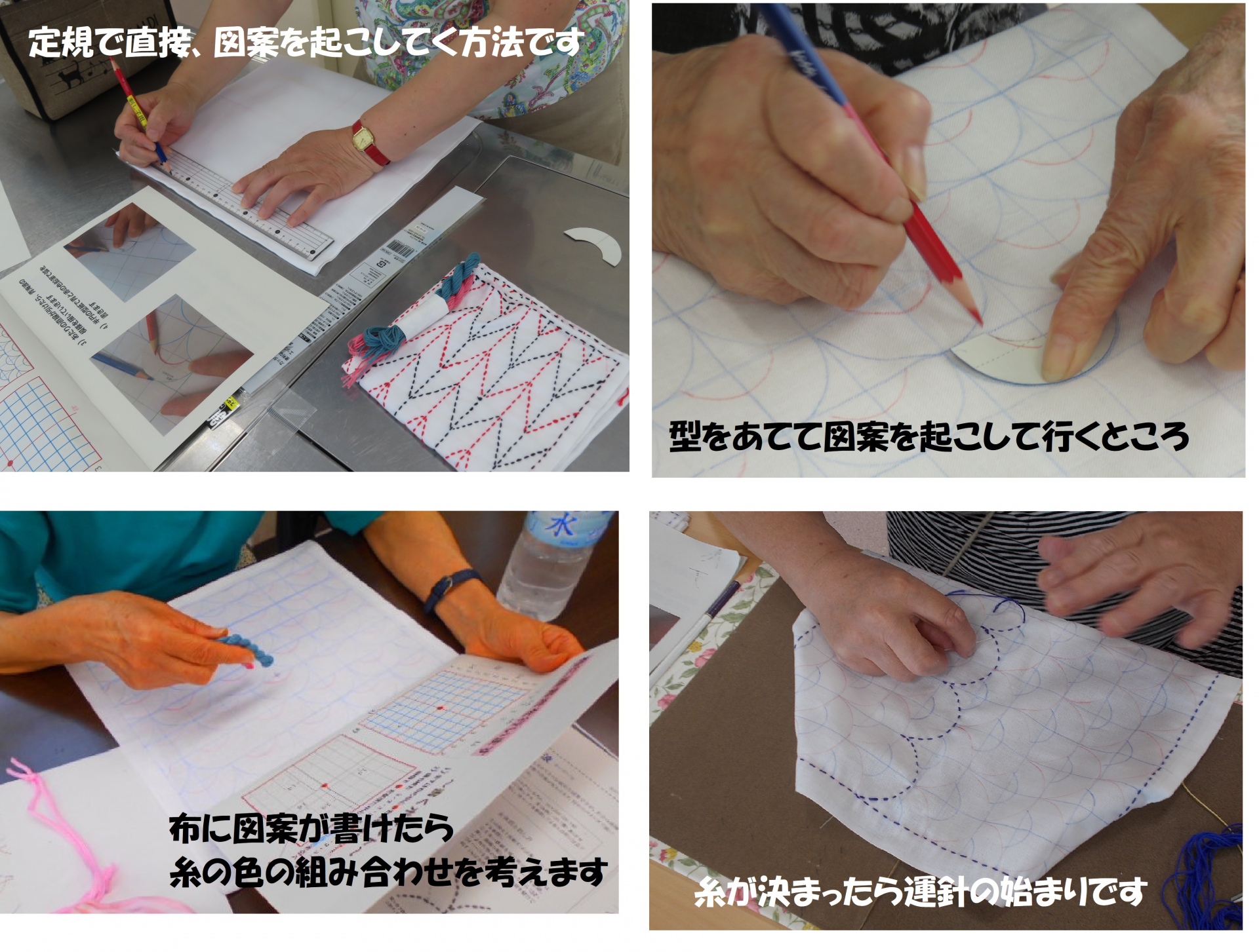 豊玉で行っている刺し子講座は製図から行い、定規で直接幾何学模様を書いたり、厚紙で型を取ったりと。本から図柄を写すときは拡大縮小の計算もします。頭をフル回転させ正確な幾何学模様を起こして行きます。また作品に模様がどの配置にするか考えたり、色とりどりの糸の色の組み合わせや、布とのマッチングなど各自で考えます!…なので皆さん「ナンプレもいいけど刺し子も頭を鍛えるのにいいわね」と言って頂けます。実際には布にそうして起こした図案を今度は専用の針で一針、一針縫いあげて行かなくてはなりません。