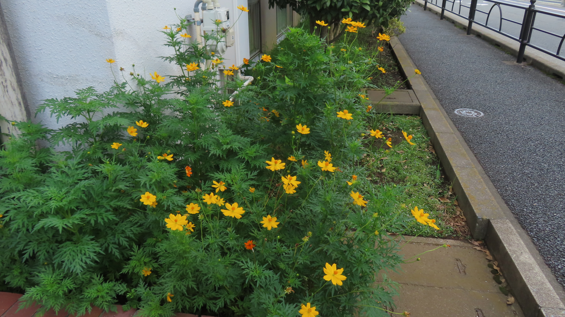 去年西側花壇に植えたキバナコスモスが元気に咲いています。