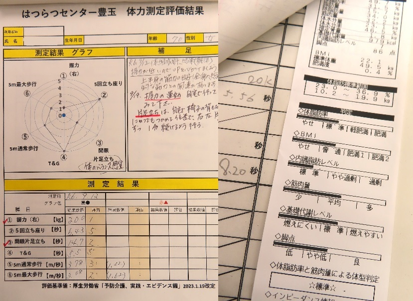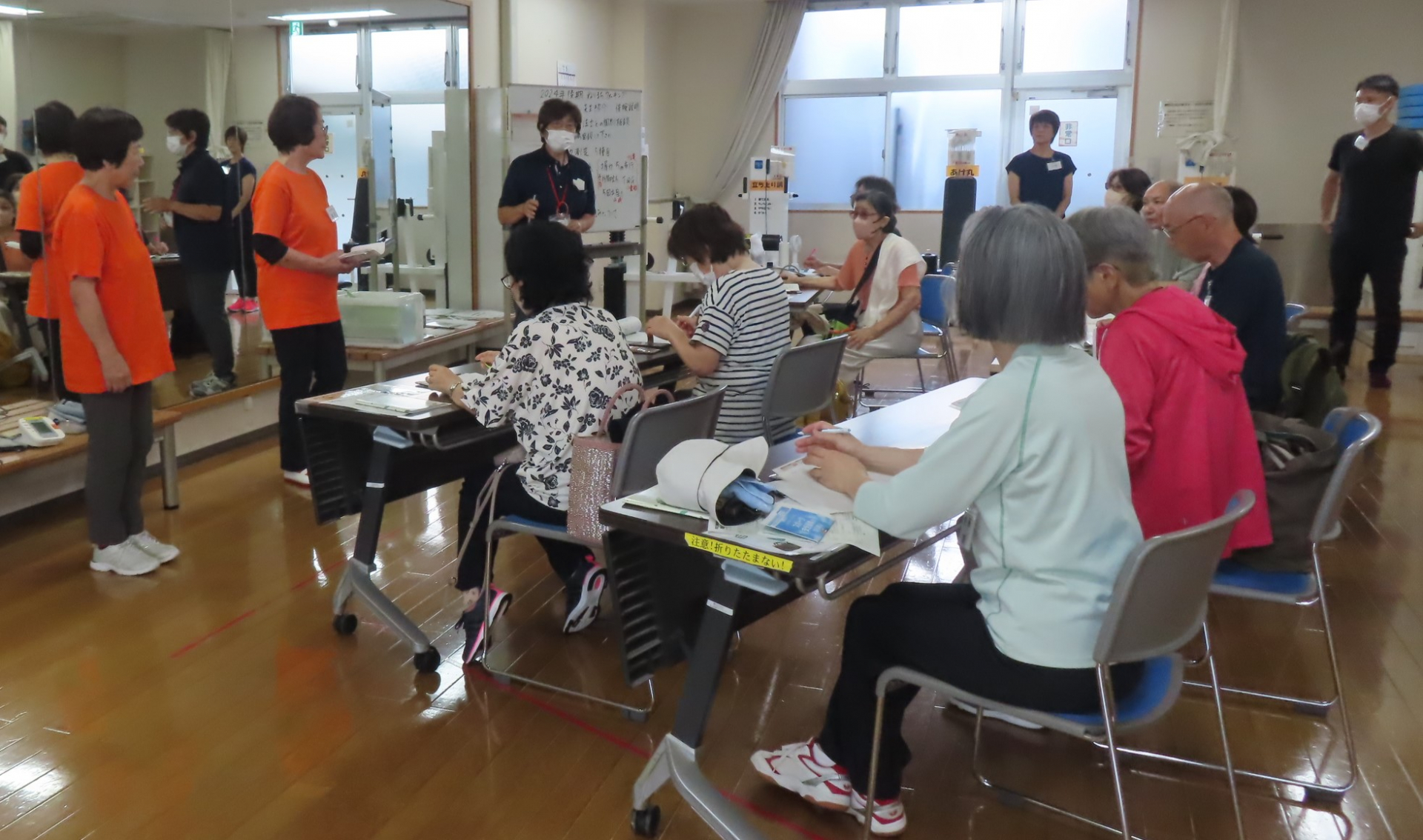 体力測定5種目(5m歩行・握力・T&G・5秒立座り・開眼片足立ち)を行い、理学療法士との個人面談に、これから始まるウオーキングの取り組みについての説明を行いました。