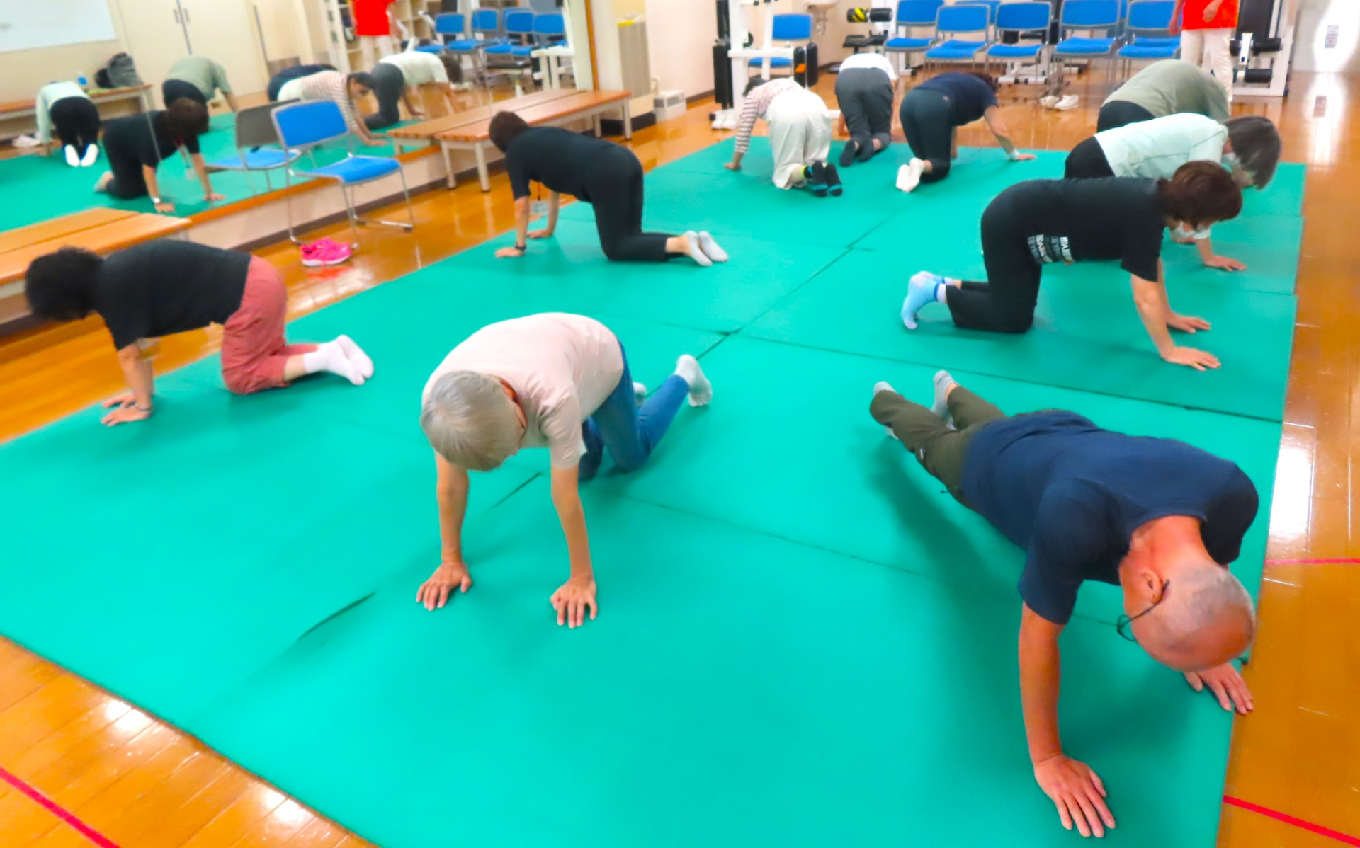 体力測定の結果、これから各自で特に取り組む 基礎代謝を上げるための心掛けや実際に握力強化の4項目の体操と、片足立ち、立座りのためのスクワット運動を行いました。