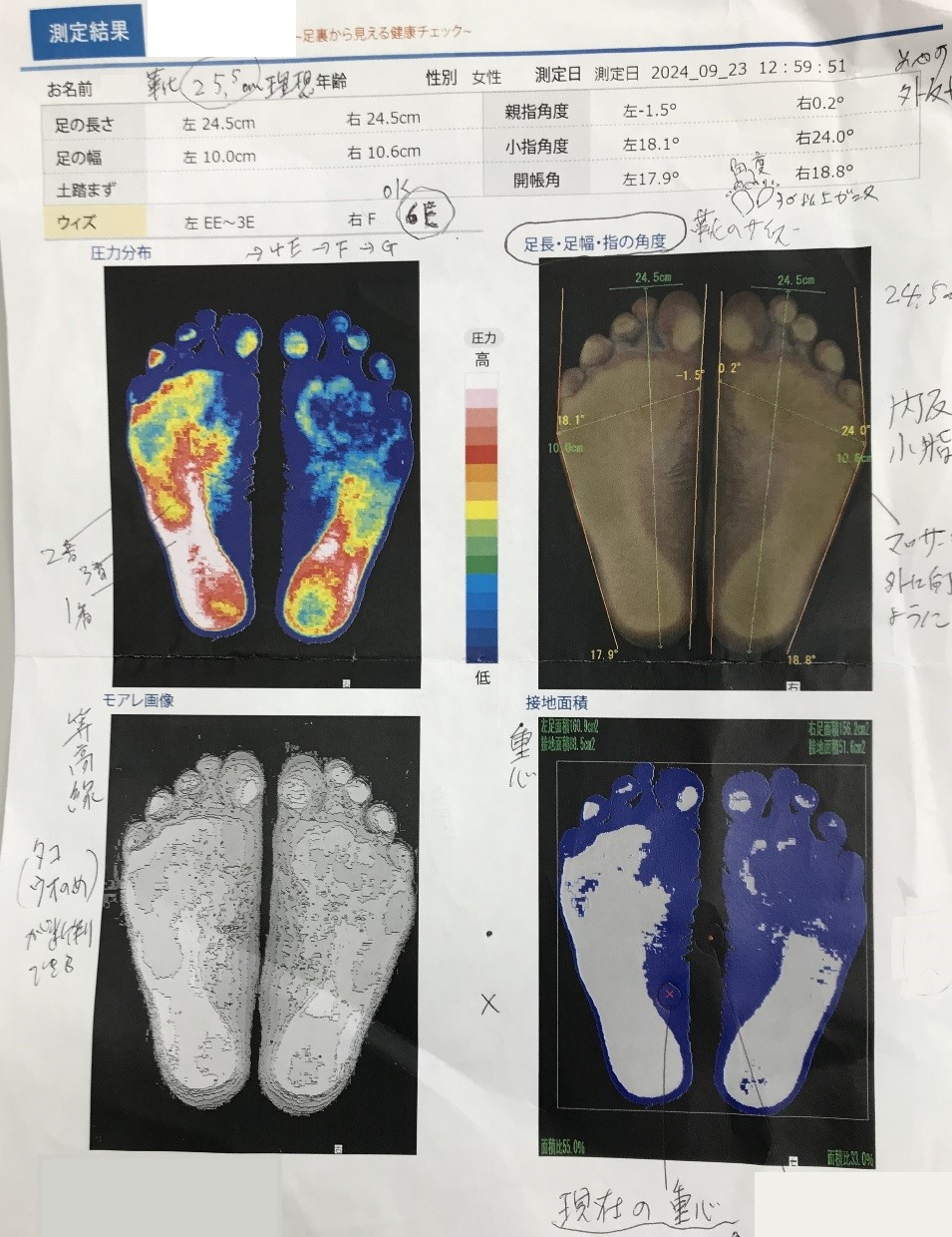 自分が長年履いていた靴のサイズが0.5㎝小さかったこと。年齢を重ね足の指の変型が出て来ていたこと。しっかり足の指を使って歩けていないのがスキャンで判明! 豊岡の職員早川氏が測定器とアプリを使って解析して下さり、ひとり一人にアドバイスを下さいました。
