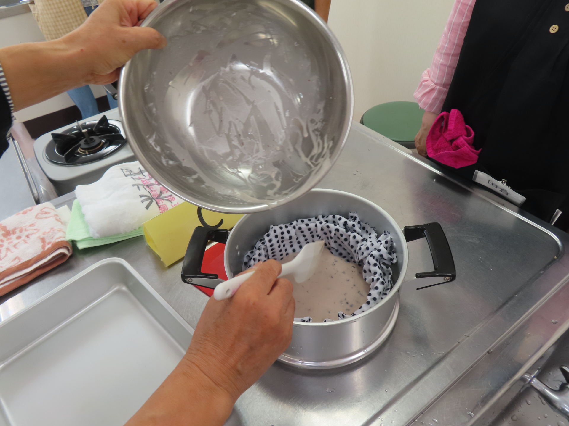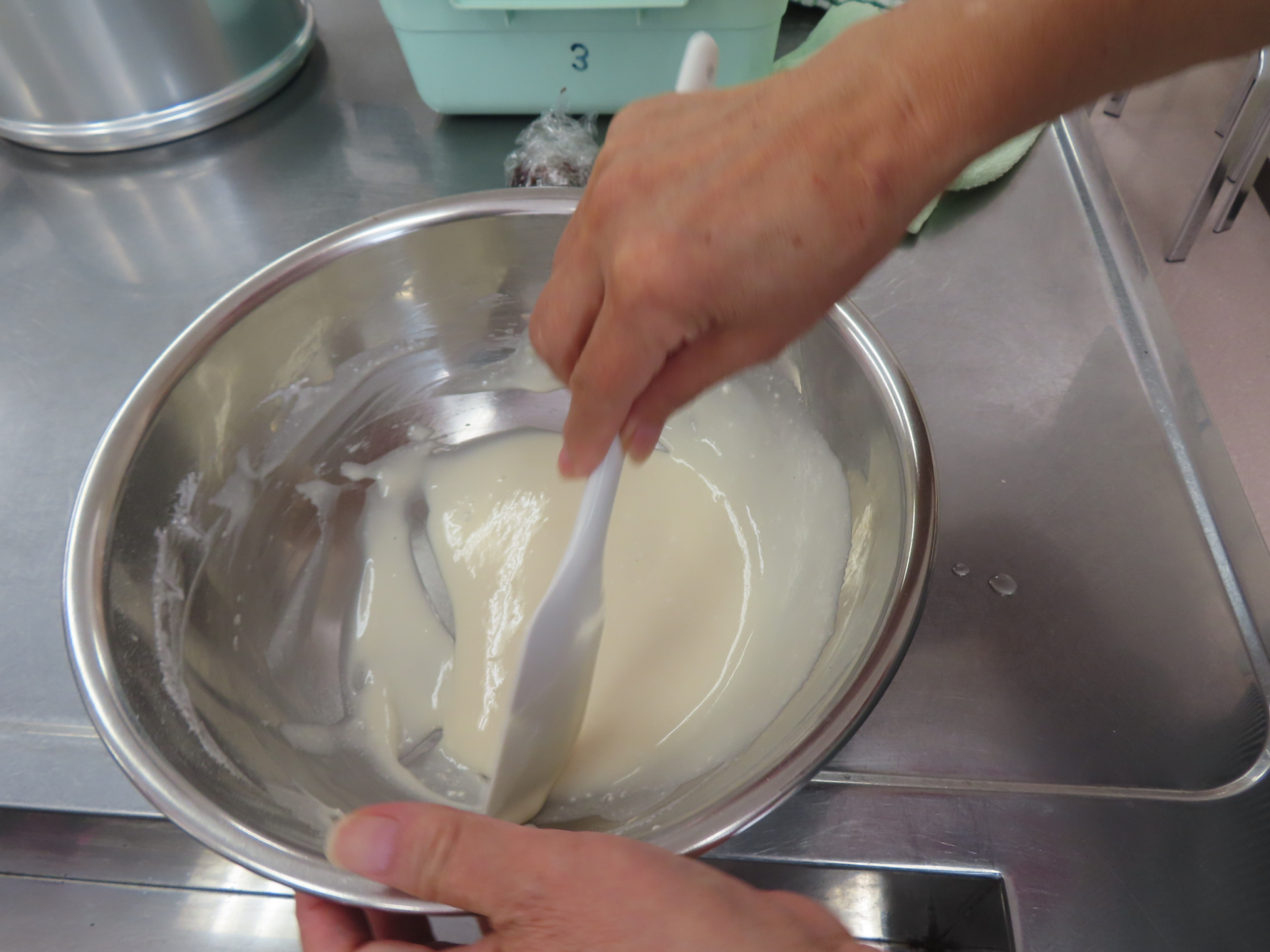 こねあがった生地を「さらしあん」を敷いたバットに落として人数分10等分に分けます。