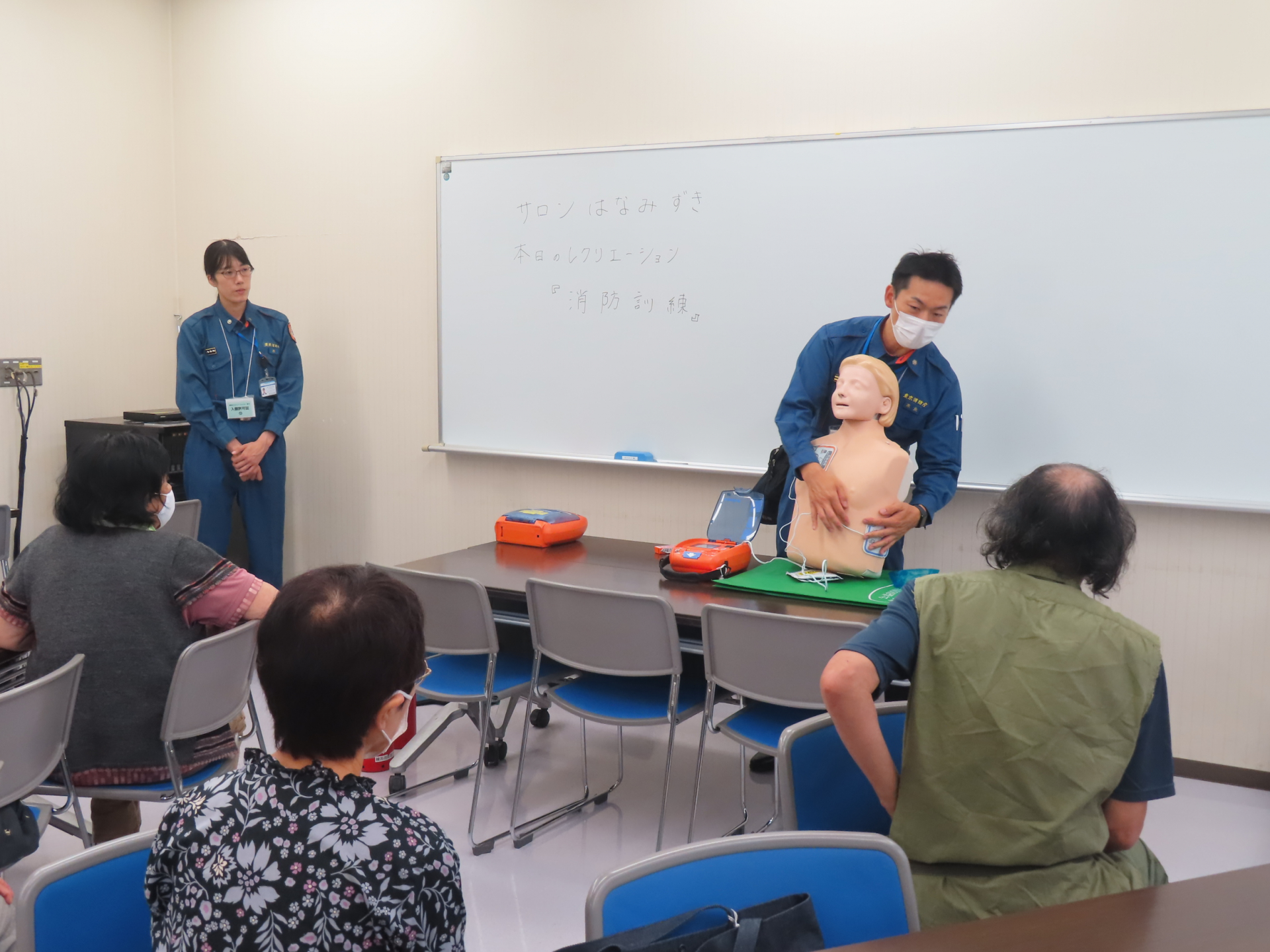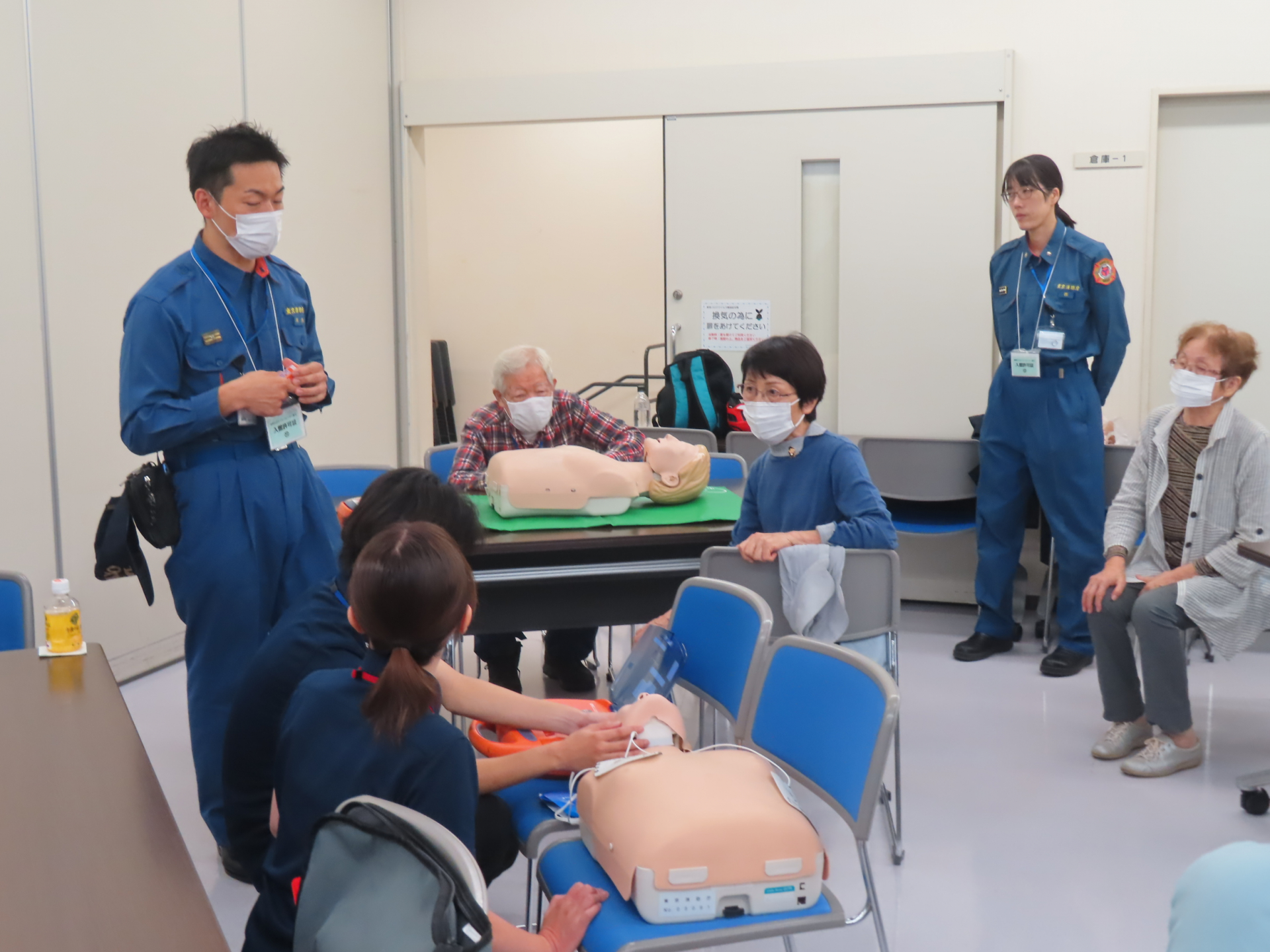 実際にセンター内にあるAEDの場所に練習用の機械を置いて、