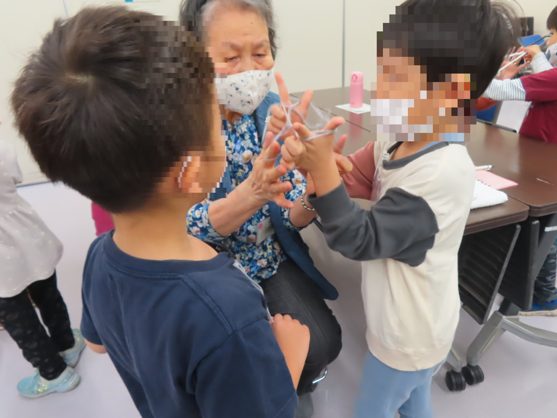 体を動かす脳トレの後、ジャンケンやあやとりで交流しました。