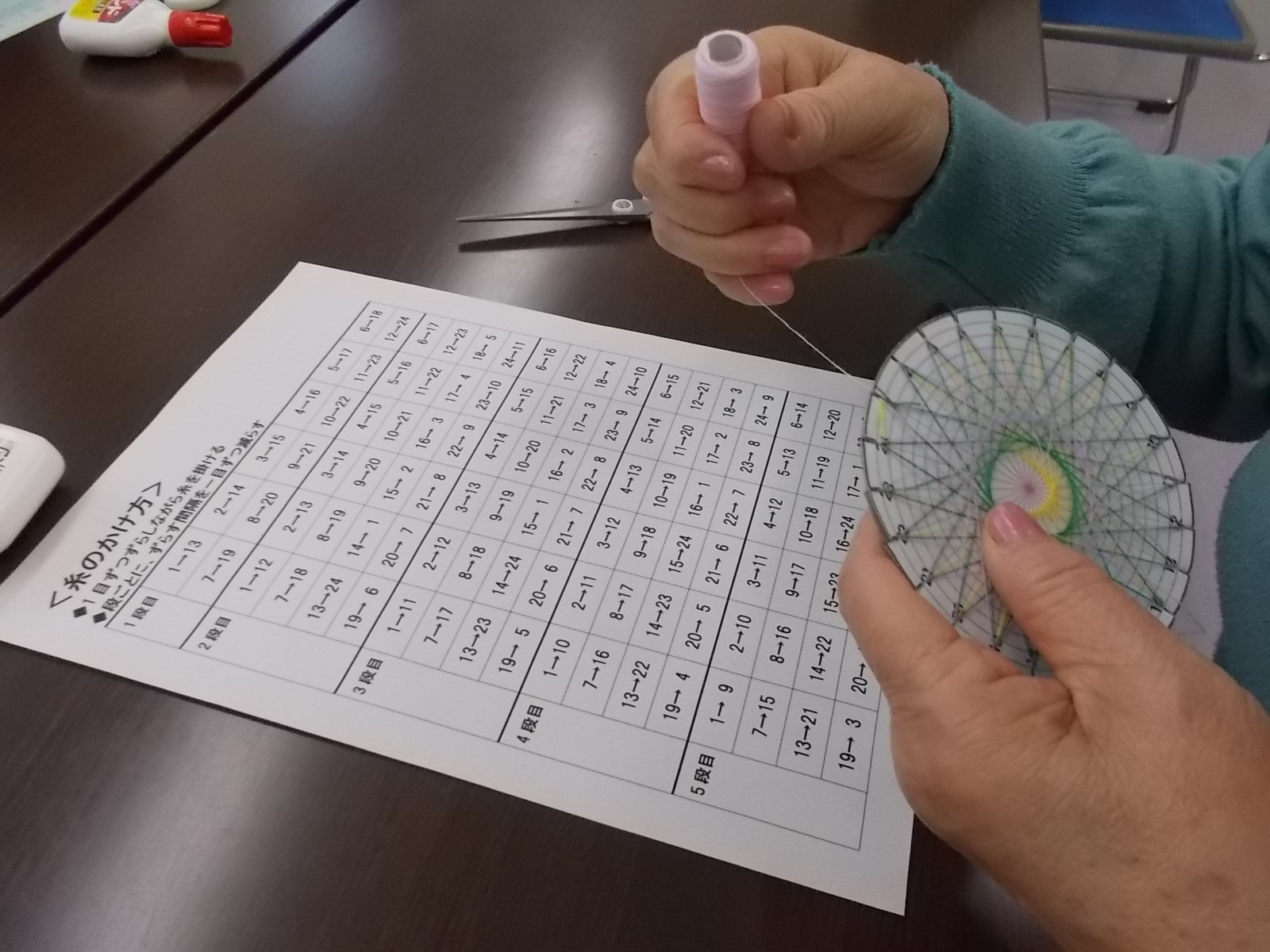 『糸掛けアート』とは、切り込みを入れたラウンド型の紙に、糸を掛けて模様を作っていくアートになります。