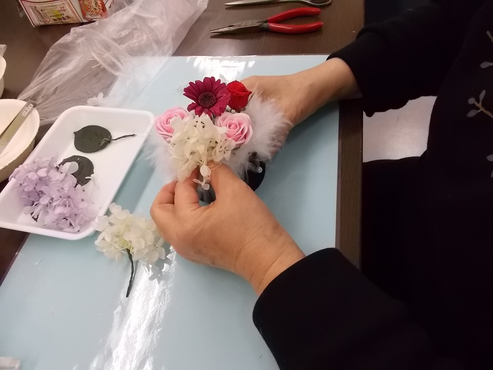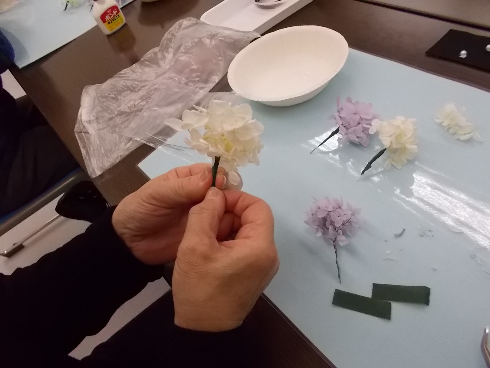 そしてプリザーブドフラワーの紫陽花とバラの葉をワイヤリングしてテーピングすればパーツの出来上がりです。