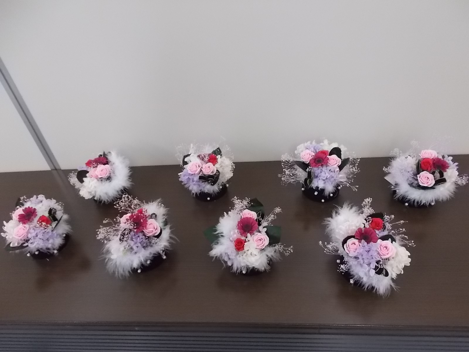今回のアレンジメントはプリザーブドフラワーとソープフラワーのみを使った贅沢なアレンジメントで