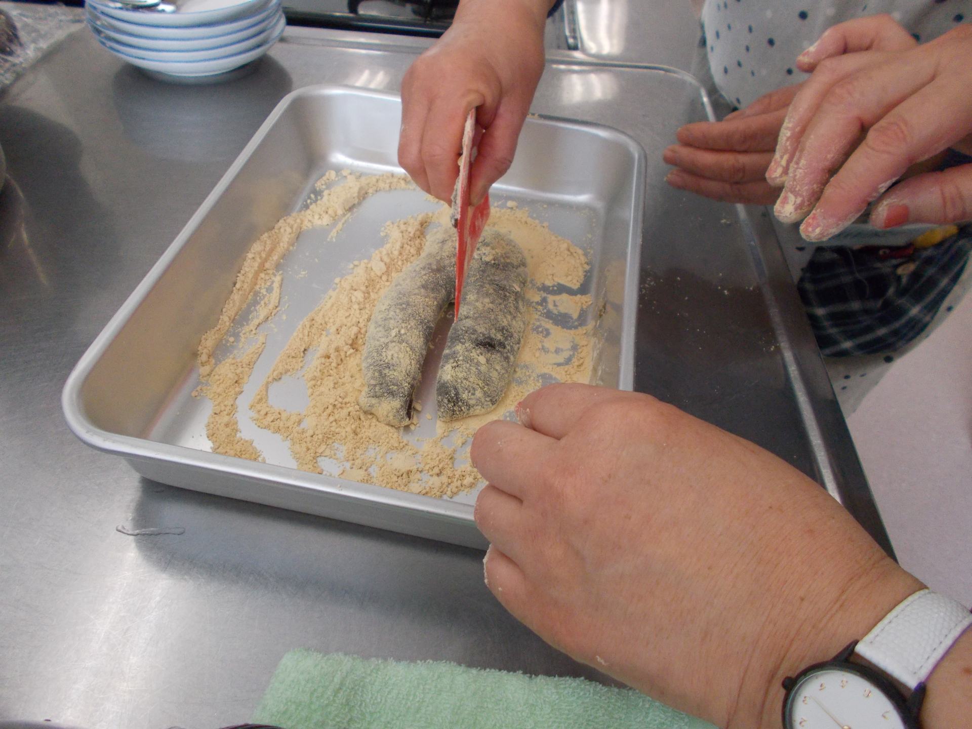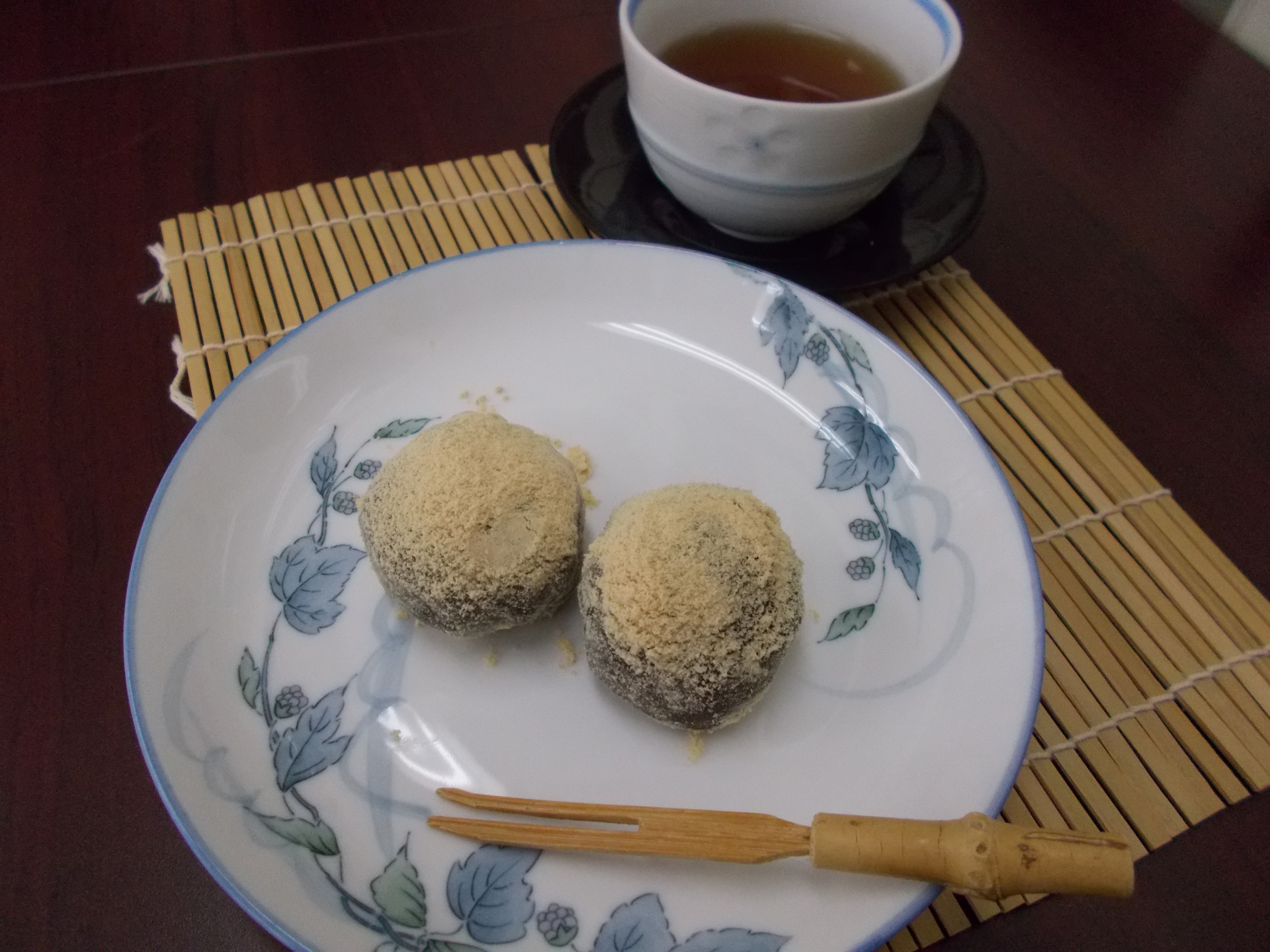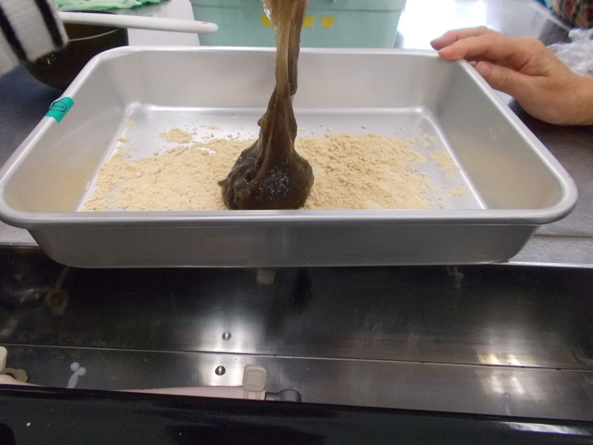 練り上げた生地を黄な粉の上に落としたら、二つ折りにします。