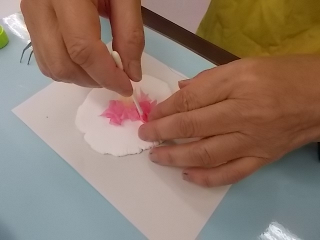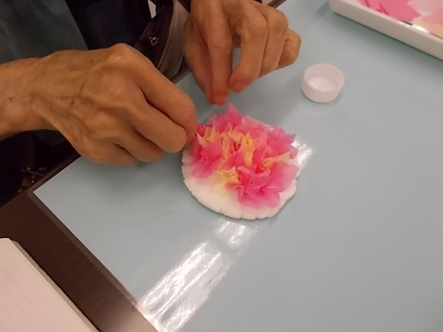 紙粘土で作った土台にお花紙を埋め込んでいきます。