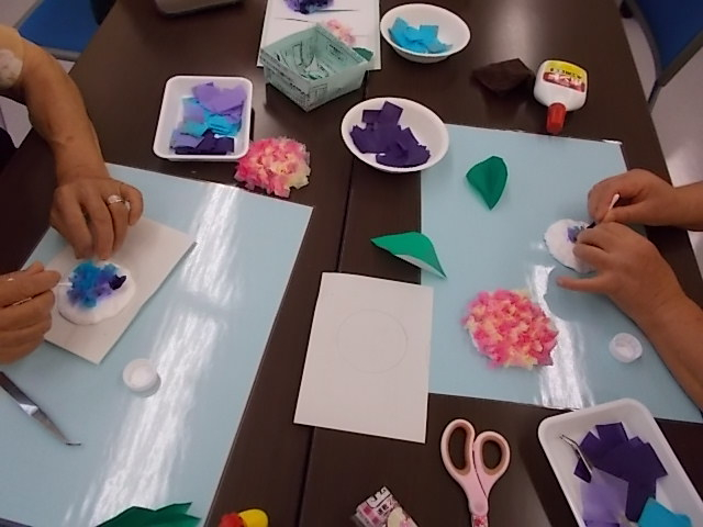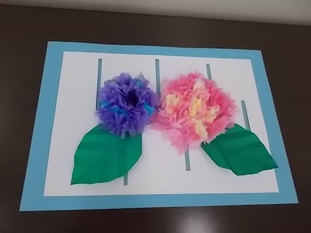 6月の花の「紫陽花」を紙粘土とお花紙でつくりました。