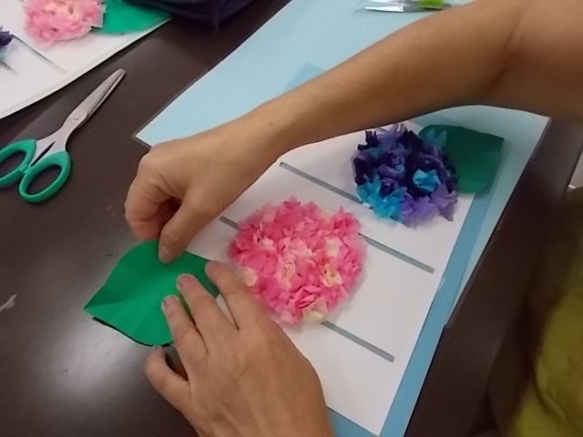 ピンクの紫陽花と紫の紫陽花を作ります。台紙に花と葉を飾ってできあがりです。