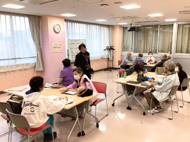 まずは、各自の家から避難拠点までの地図を作製します。自分の書いた防災コース上にブロック塀がないか、頭上から落下しそうな電線や大きなガラス窓はないかなど実際に講座終了までに歩いていただけるよう促し、家族との待ち合わせ場所や連絡方法などを確認すること、今の備品で足りているか東京防災備品チェック表を3台のアイパットを使い、各自の結果をもとにグループで話し合いました。そして本日歩くコースの説明をして、いざ出発です!