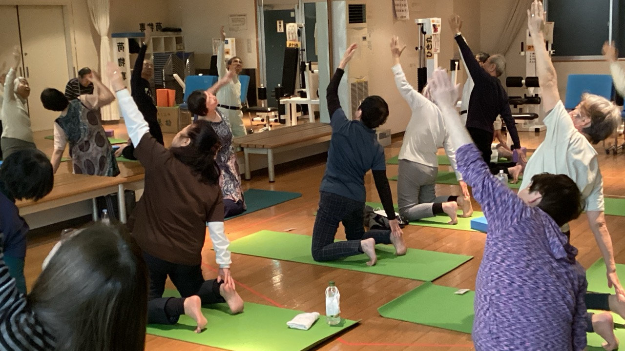 各部の手当てやストレッチの後は、膝立ちや立位・仰向けなど様々な体位でのヨガのポーズも・・・。