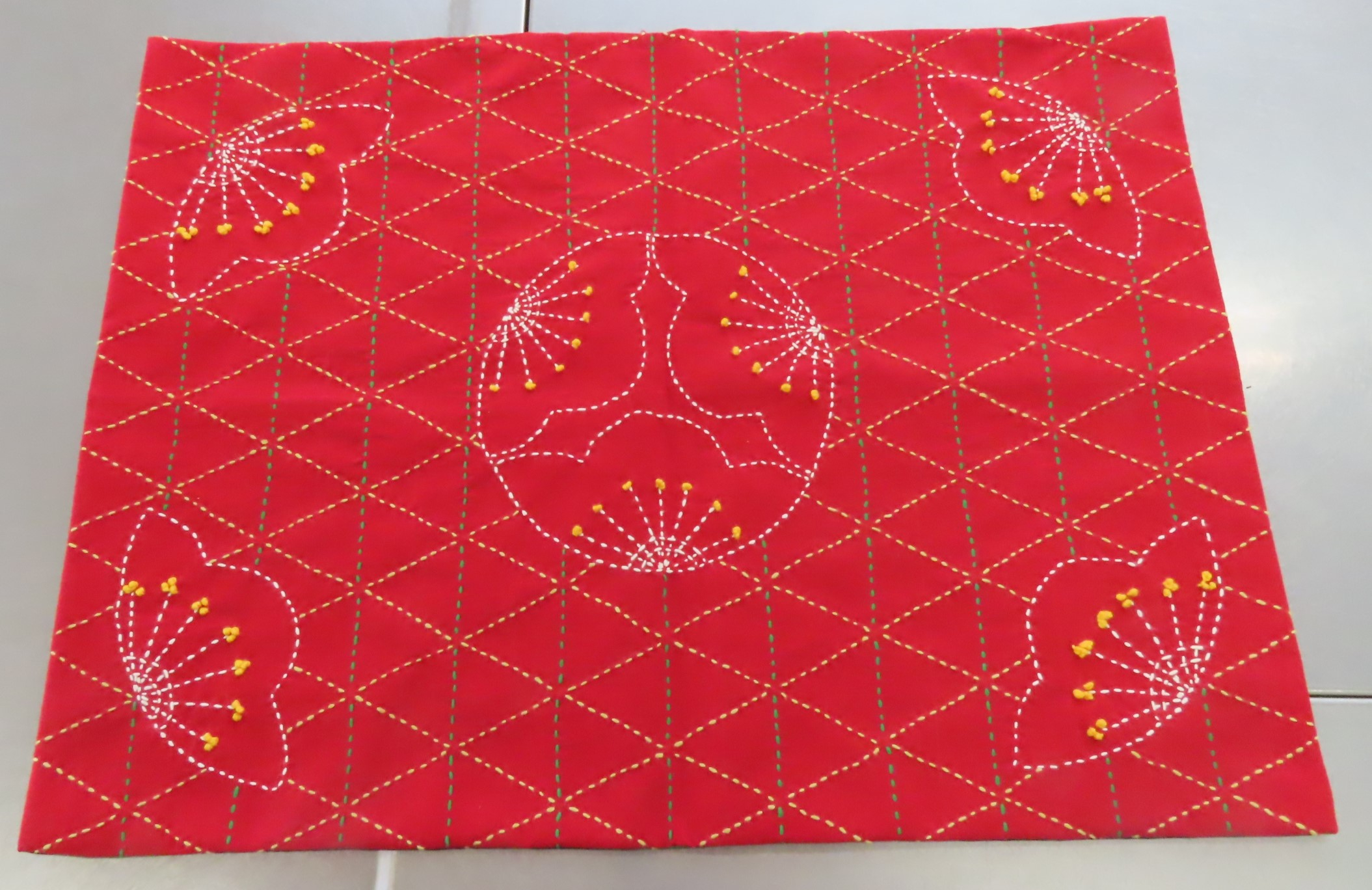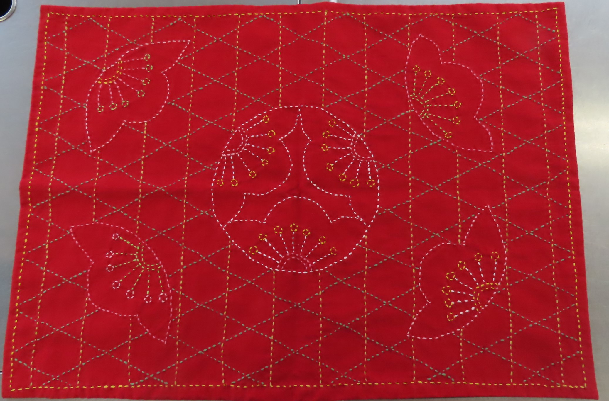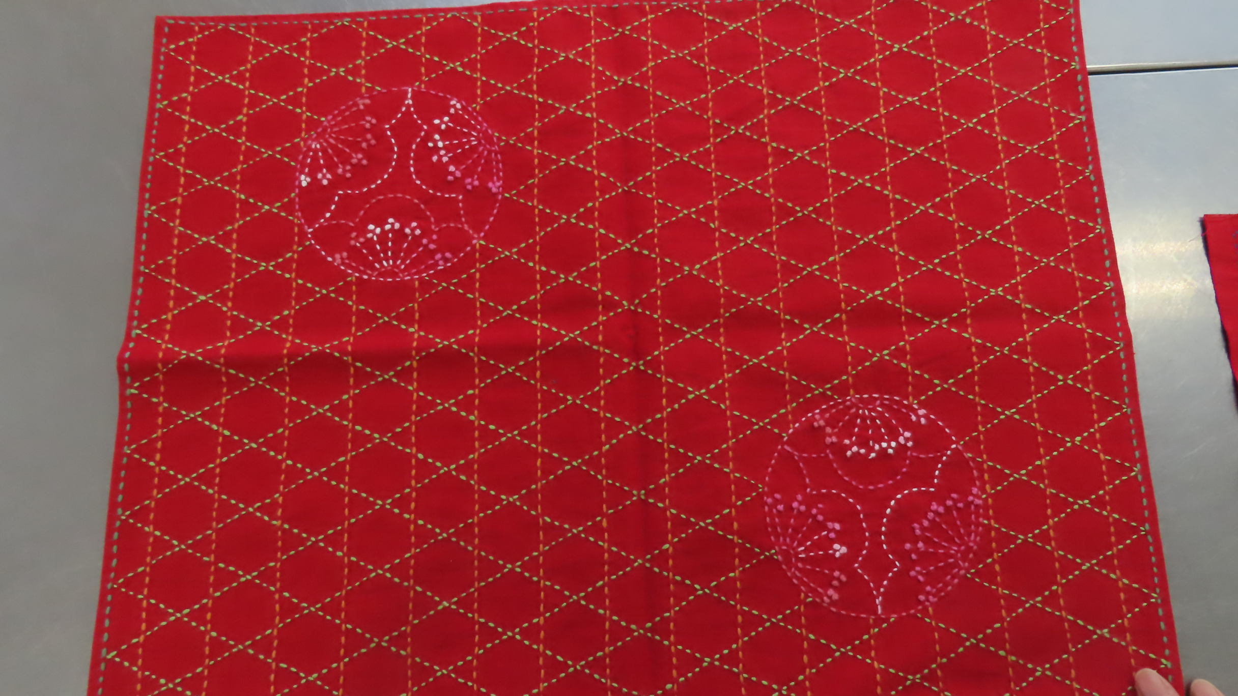 生地が赤いので皆さん、糸の色をそれは考え抜いて決められていました。赤は魔除けの意味もあり、新年から魔を払い 良い年になるようにと、思い切って挑戦して頂きました。