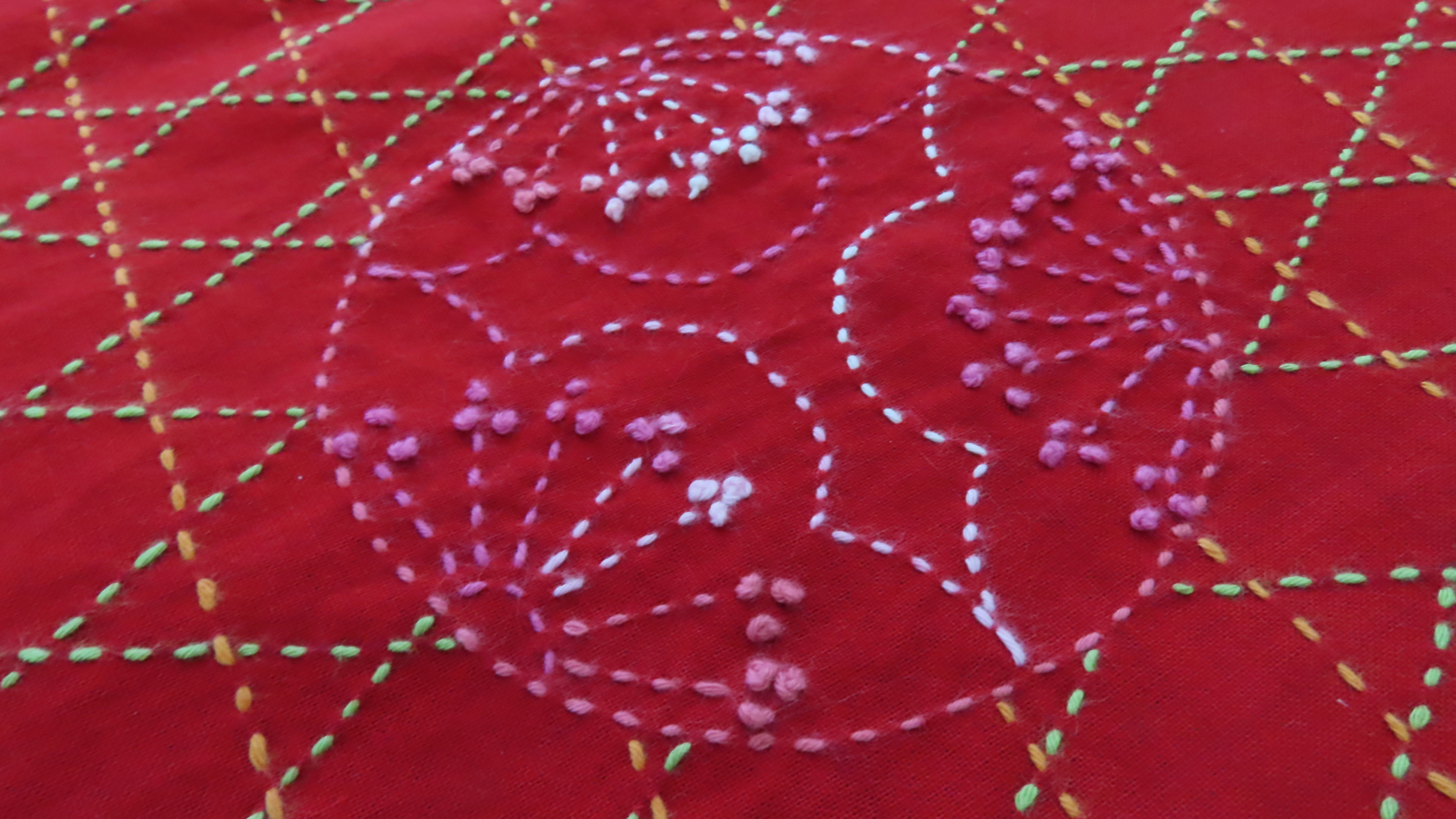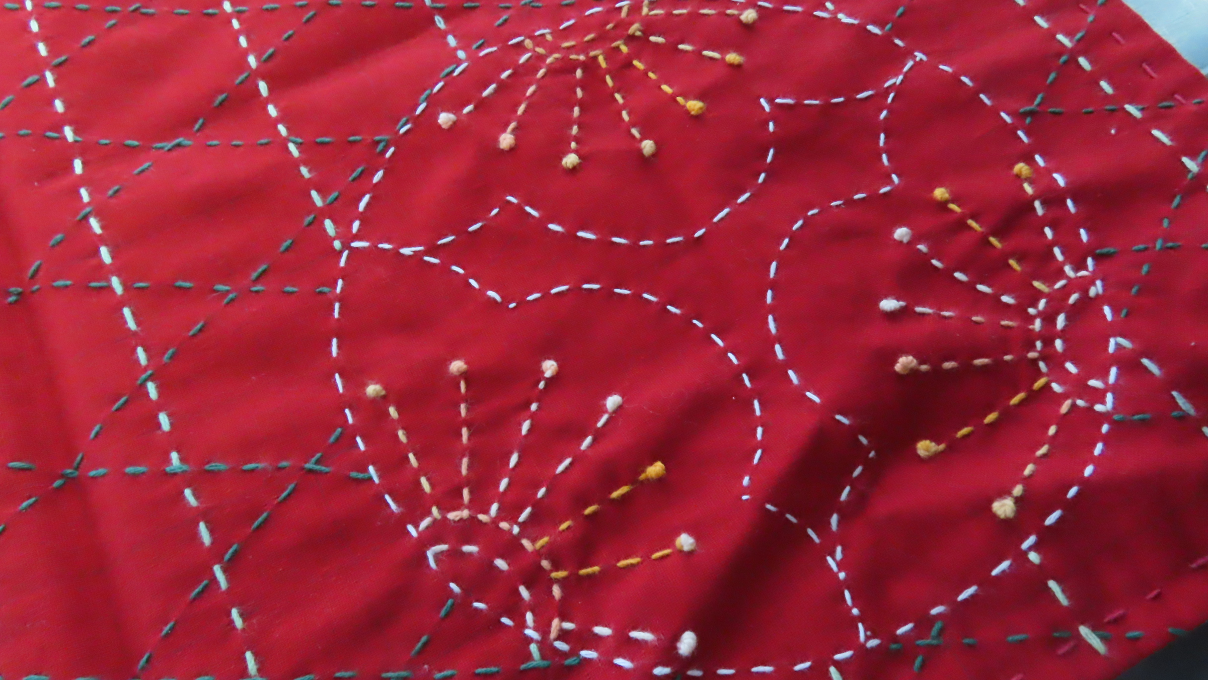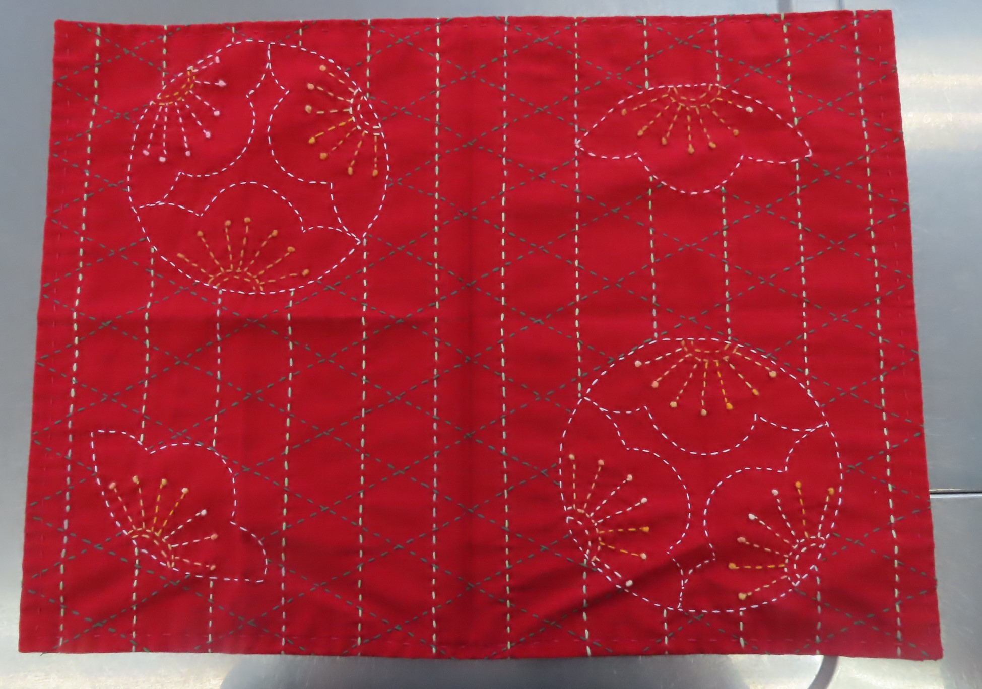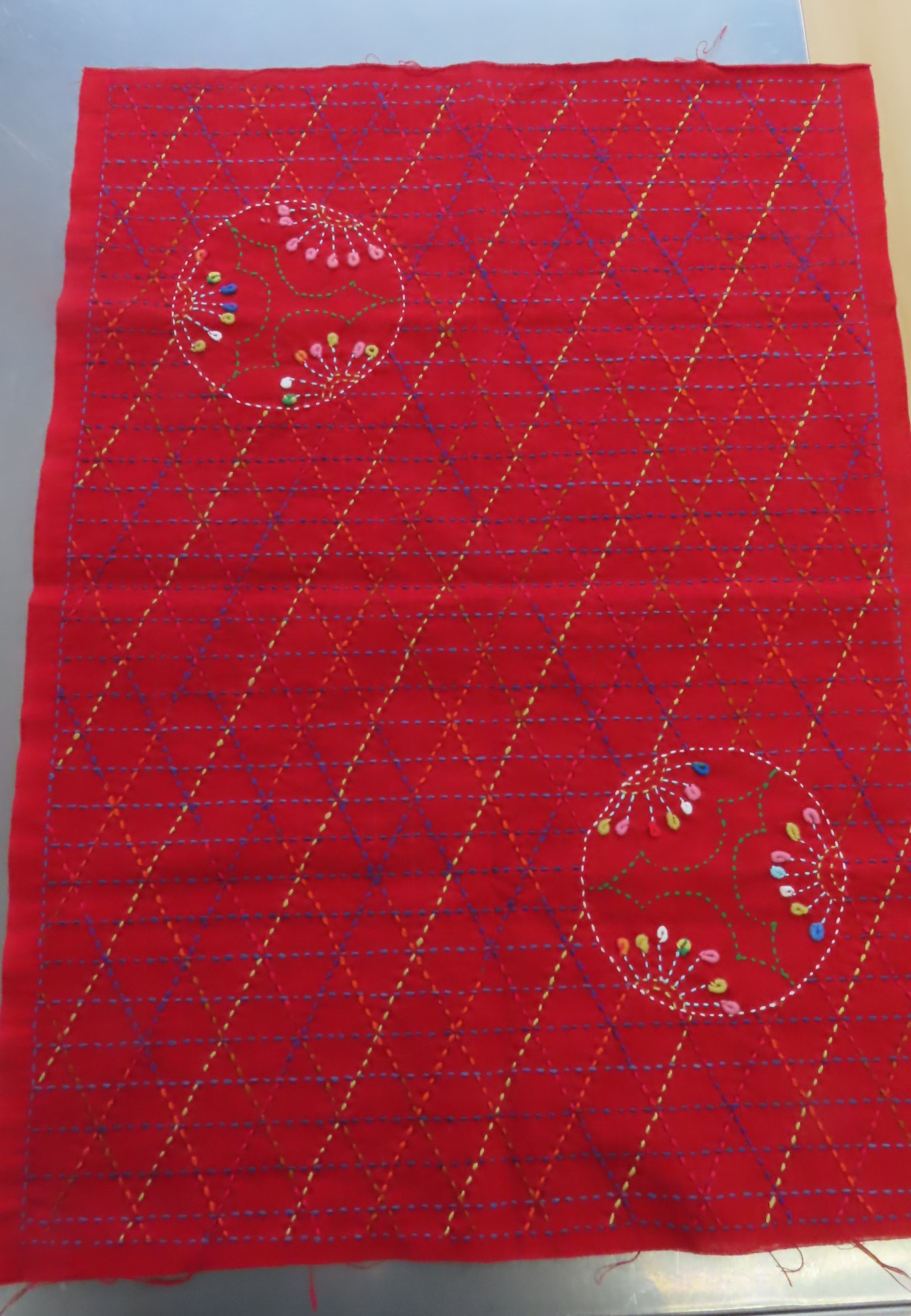 生地が赤いので皆さん、糸の色をそれは考え抜いて決められていました。赤は魔除けの意味もあり、新年から魔を払い 良い年になるようにと、思い切って挑戦して頂きました。