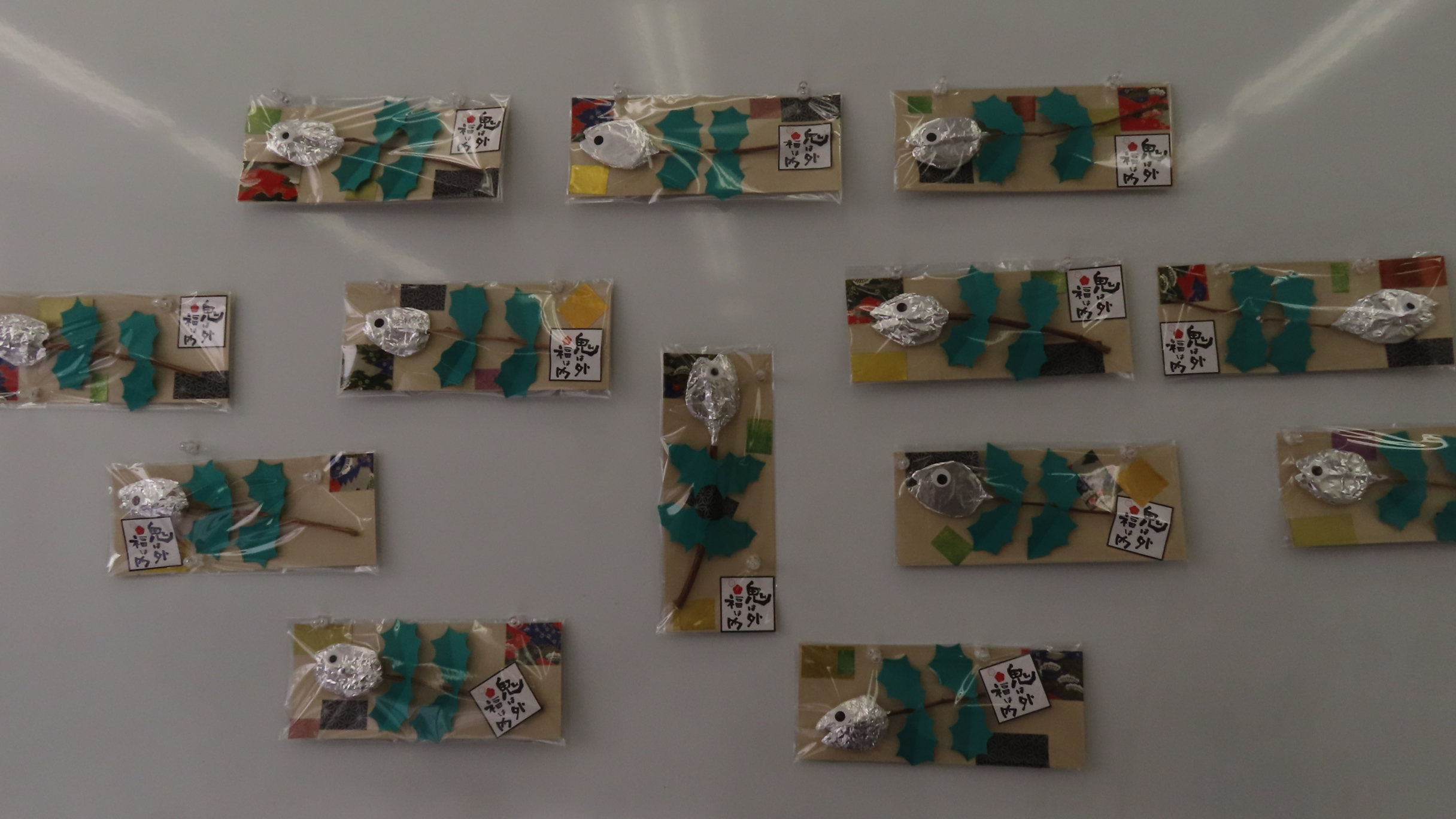 みなさん慎重にひいらぎの葉や装飾を貼り付け、それぞれの素敵な「ひいらぎイワシ」が完成しました!