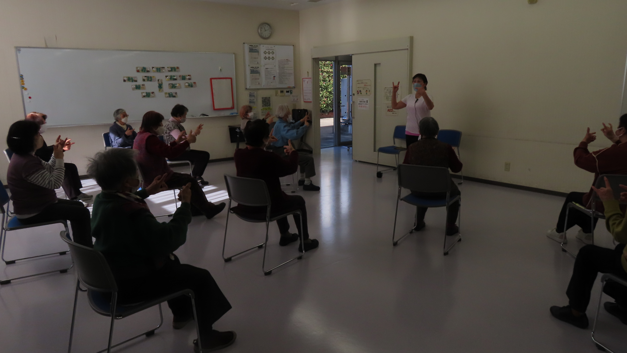 脳トレもしっかり行います。左右の手を交互にキツネと鉄砲のかたちにします。