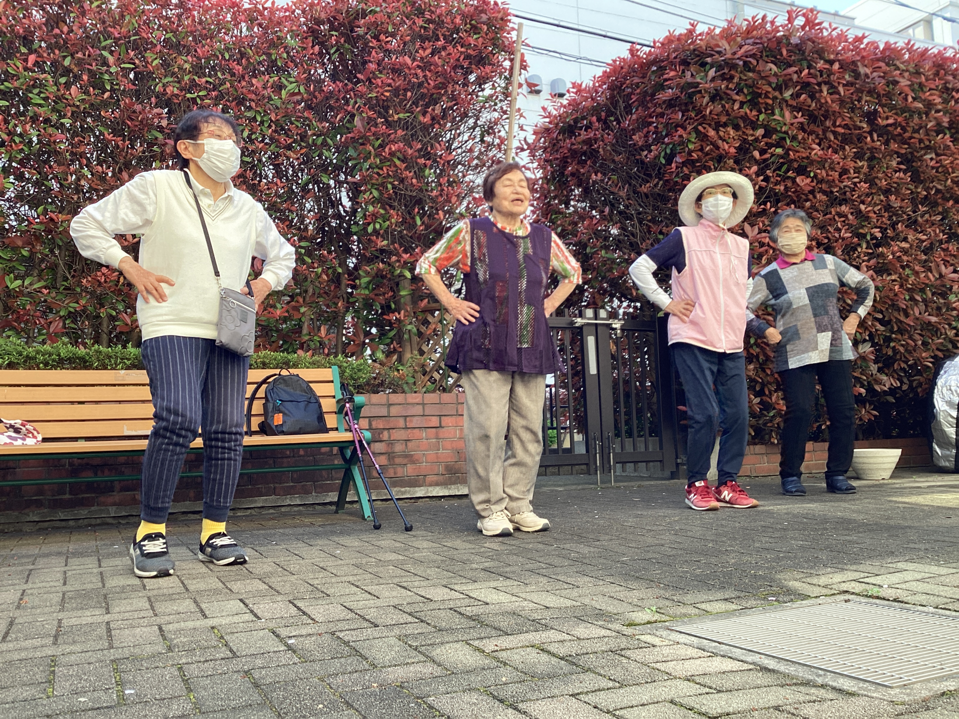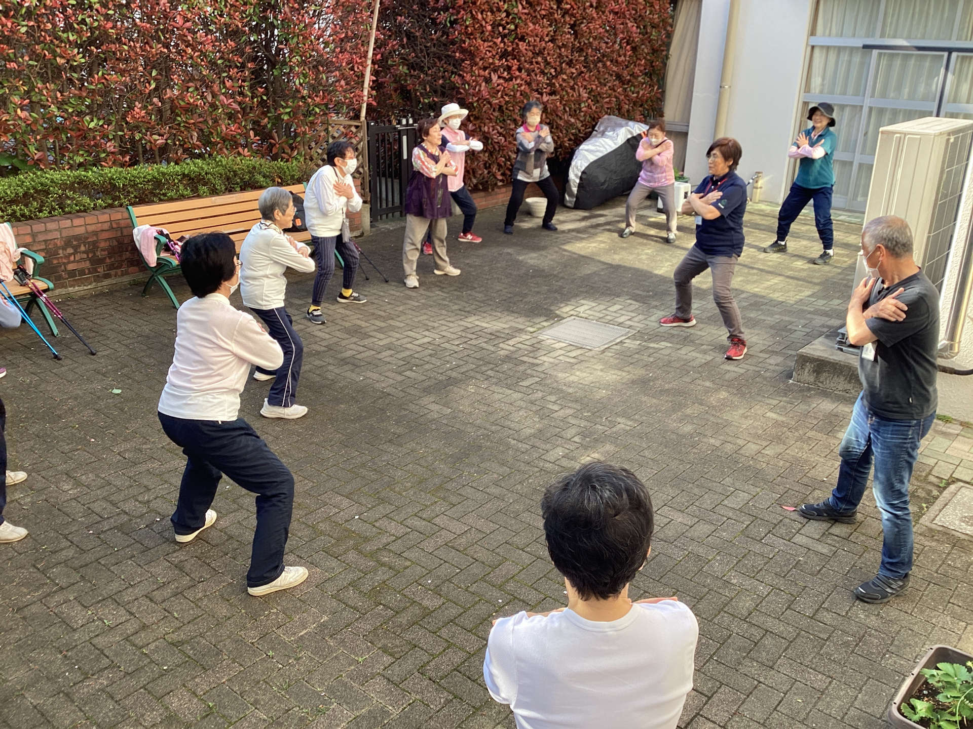 そして最後は中庭でストレッチを行いました。吸って吸って、はいて~はいて~はいて~~と腹式呼吸も行いました。