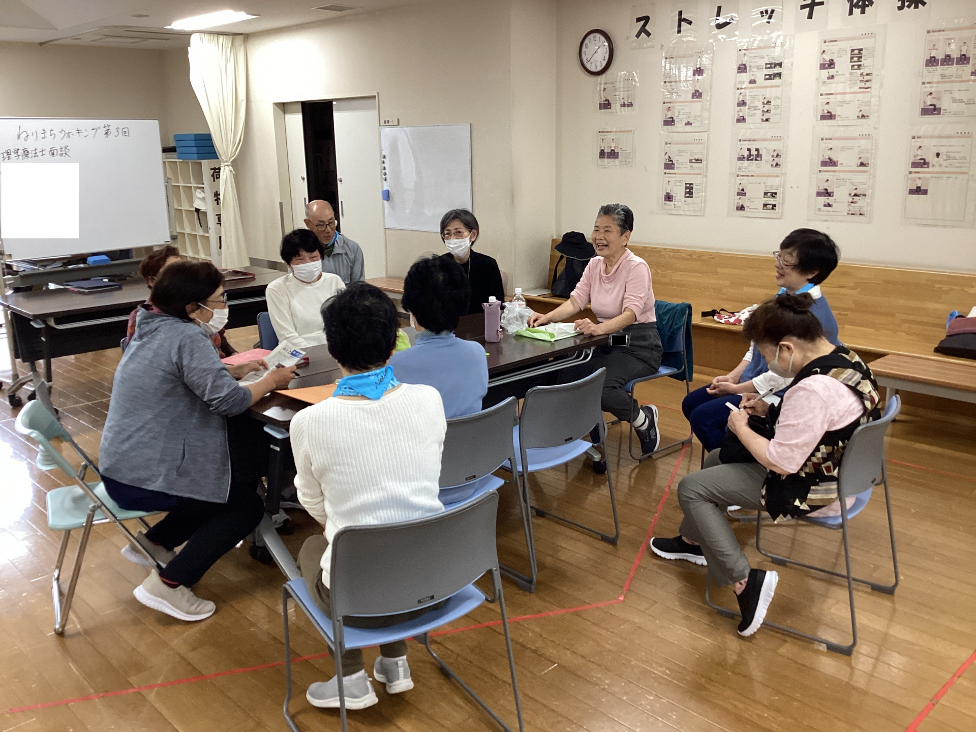 面談と並行し、ねりまちウオーキングが4月9日に始まり今日まで皆さんの生活や体調の変化を発表してもらい、他の方の取り組み方などを傾聴しました。