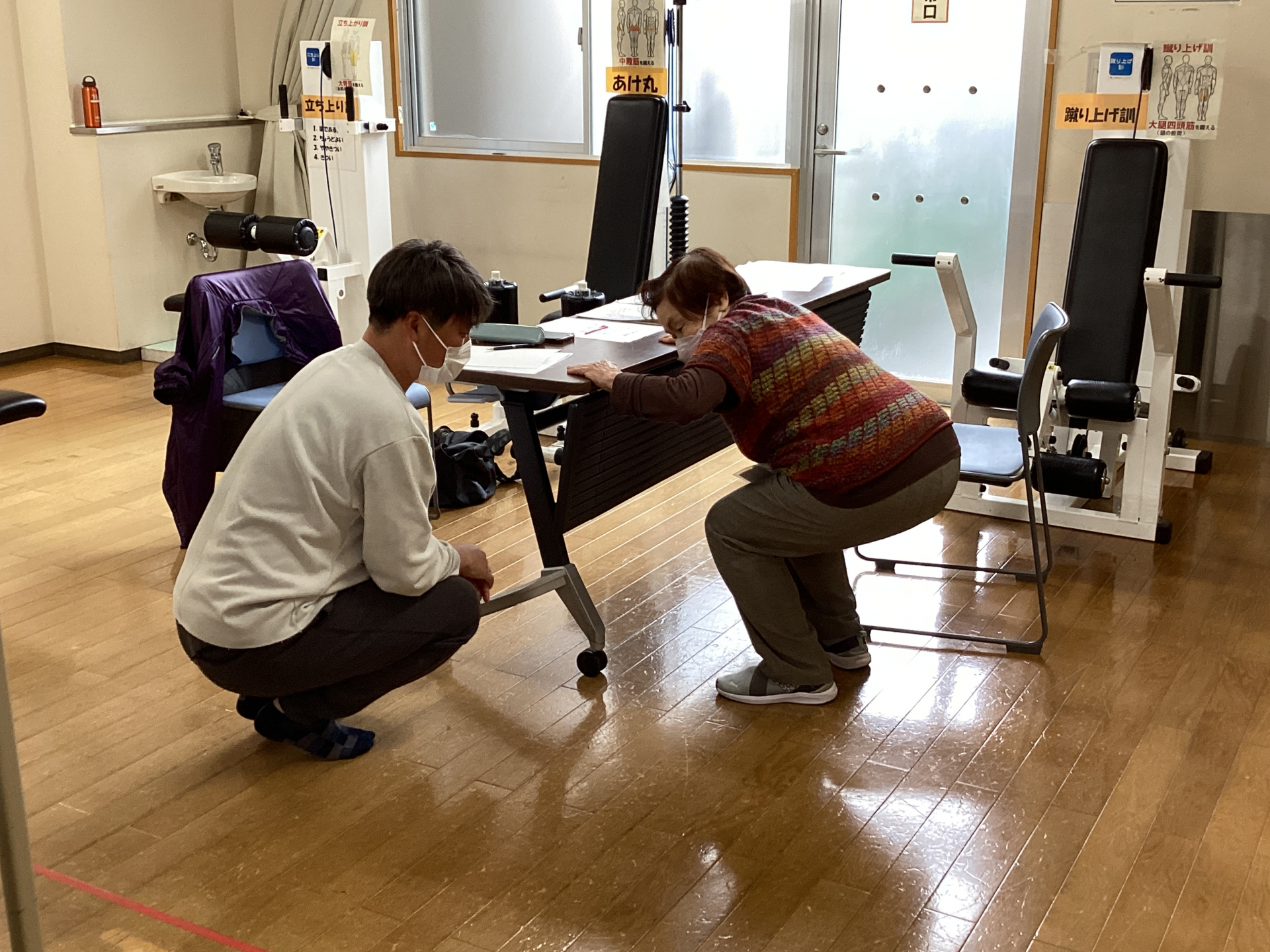 今回は理学療法士の岡崎先生をお招きして、皆さん一人一人と面談を行い日頃の身体の悩みについて相談しアドバイスをして頂きました。