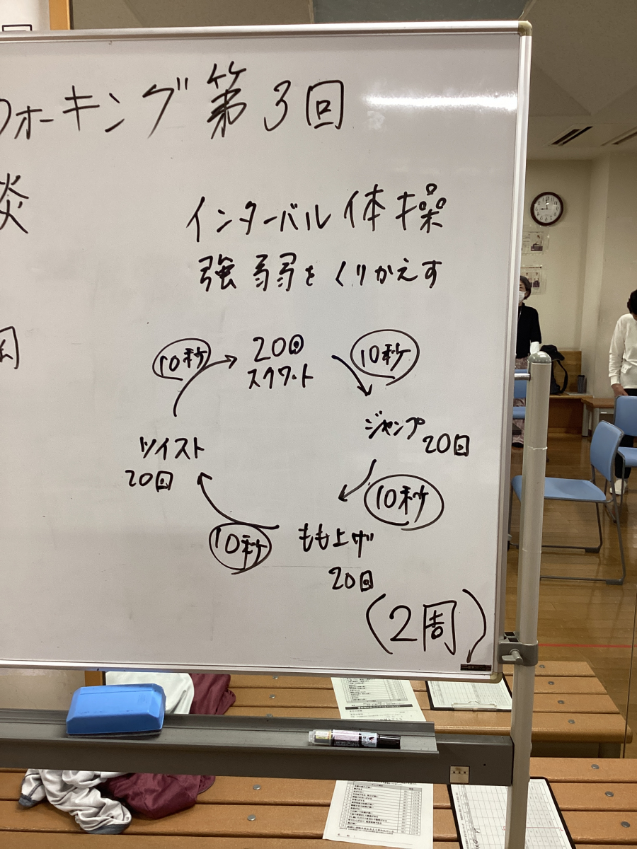 無理に続けずに身体(筋肉)の休息日をつくることも大切になってきますので少しずつ歩くことを意識しましょう。又、毎日のカリキュラムをご自身で作成することも目標を達成する指針になるかもしれません。今日から大型連休後の次回5月14日までは自主歩行として最低2か所を歩いていただき、記録を発表して頂けるようしました。