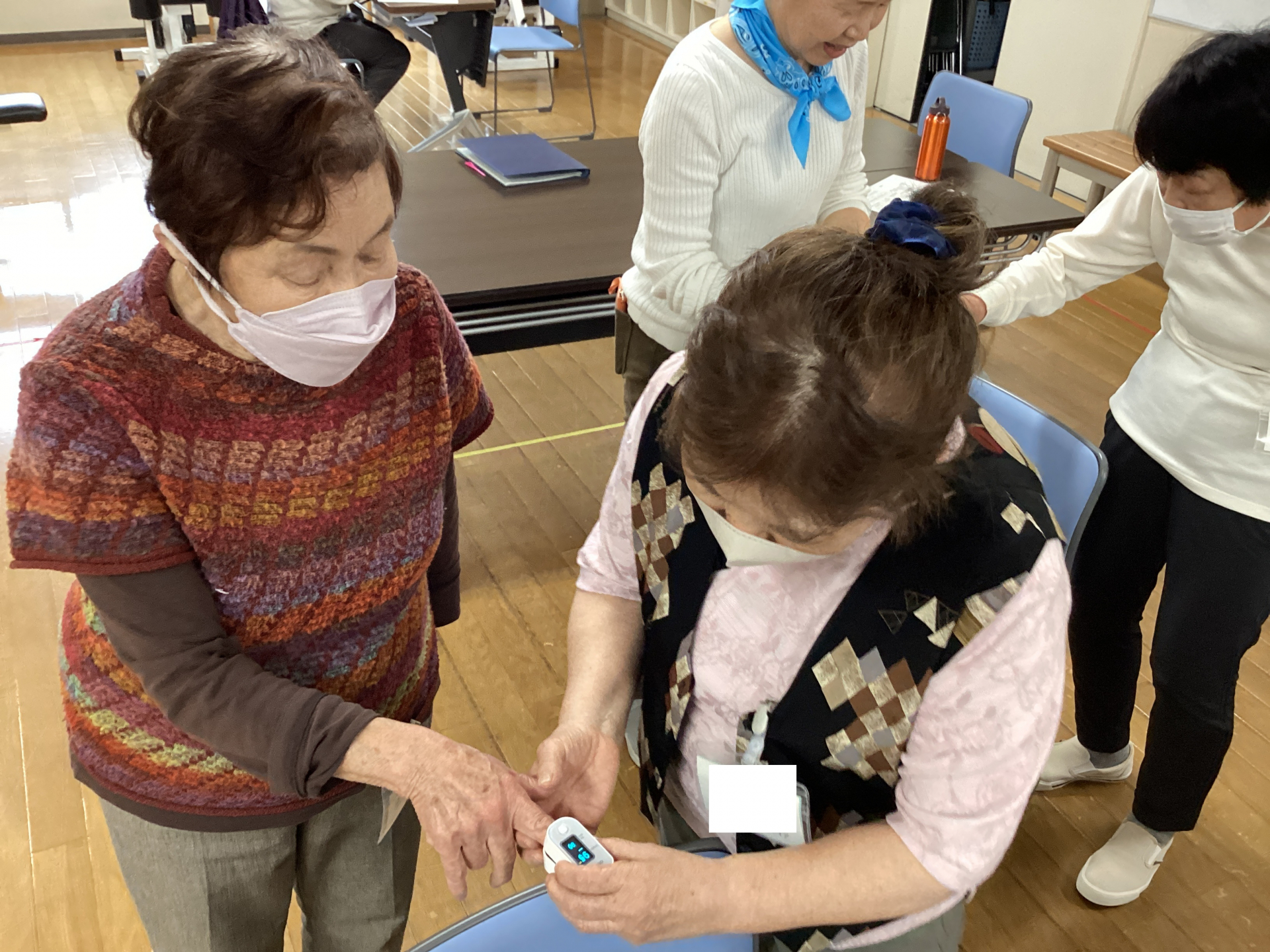 ひとり1人にボランティアさんが付いて、脈拍数と計算を確かめます。今回は脂肪燃焼率(50%増し)を超えた方と体力アップ(70%増し)を超えたの方と、他は脂肪燃焼率までいかない方々という結果でした。自分の脈拍数で運動量を計算しながら無理のない、ちょっと汗をかいてややきついと思われる程度のインターバル体操やウオーキングに強弱をつけて行うことが筋力アップにも繋がり身体全体により良い効果が出ますので自宅でも心がけてみてくださいね。