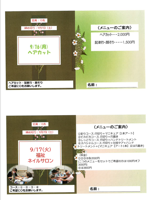毎月、ご好評をいただいておりますヘアカットと福祉ネイルを9月も開催いたします。