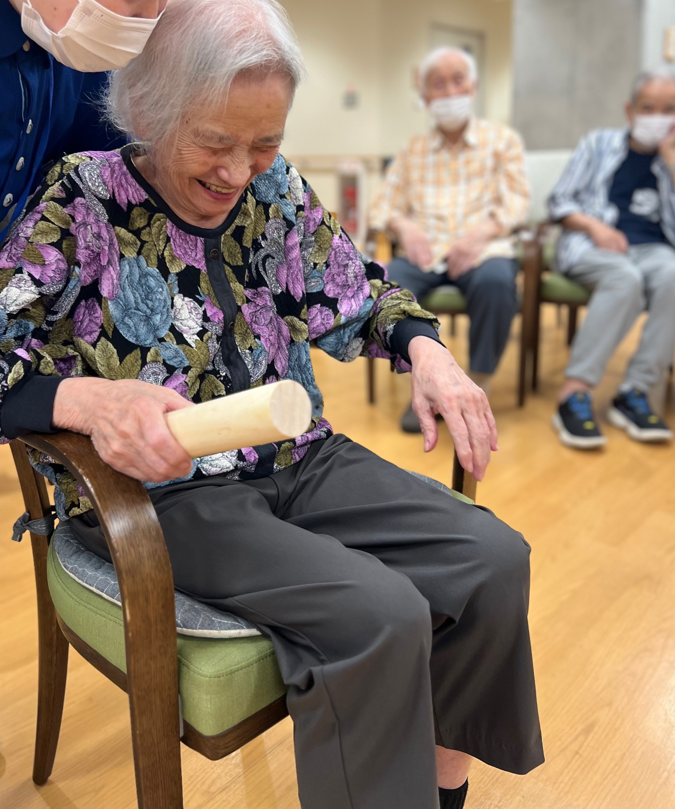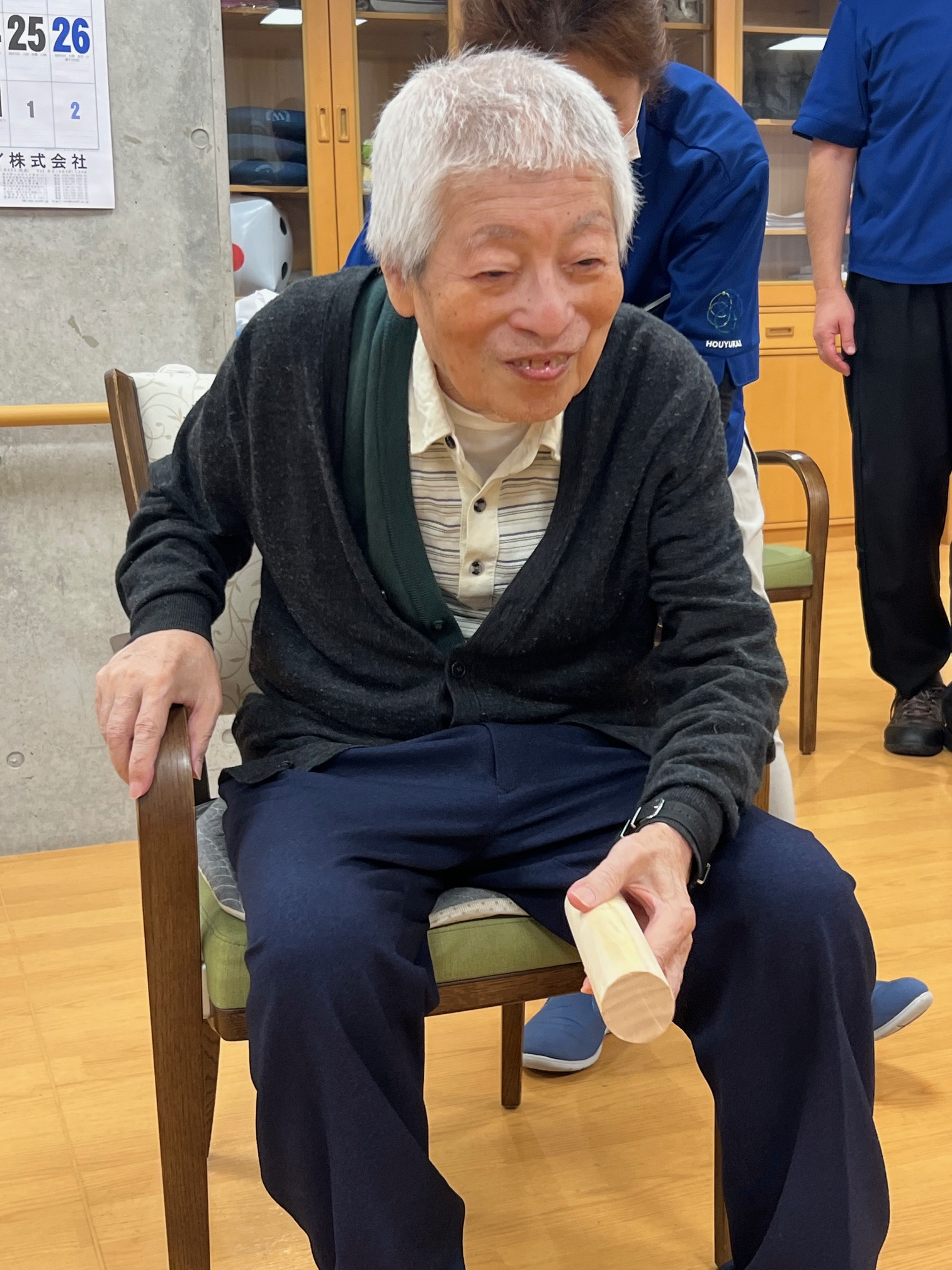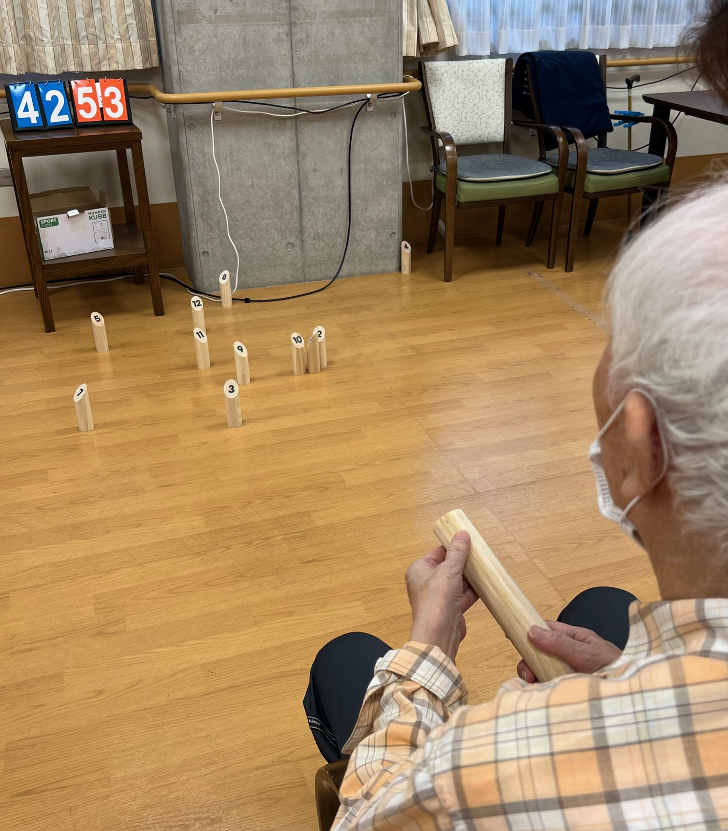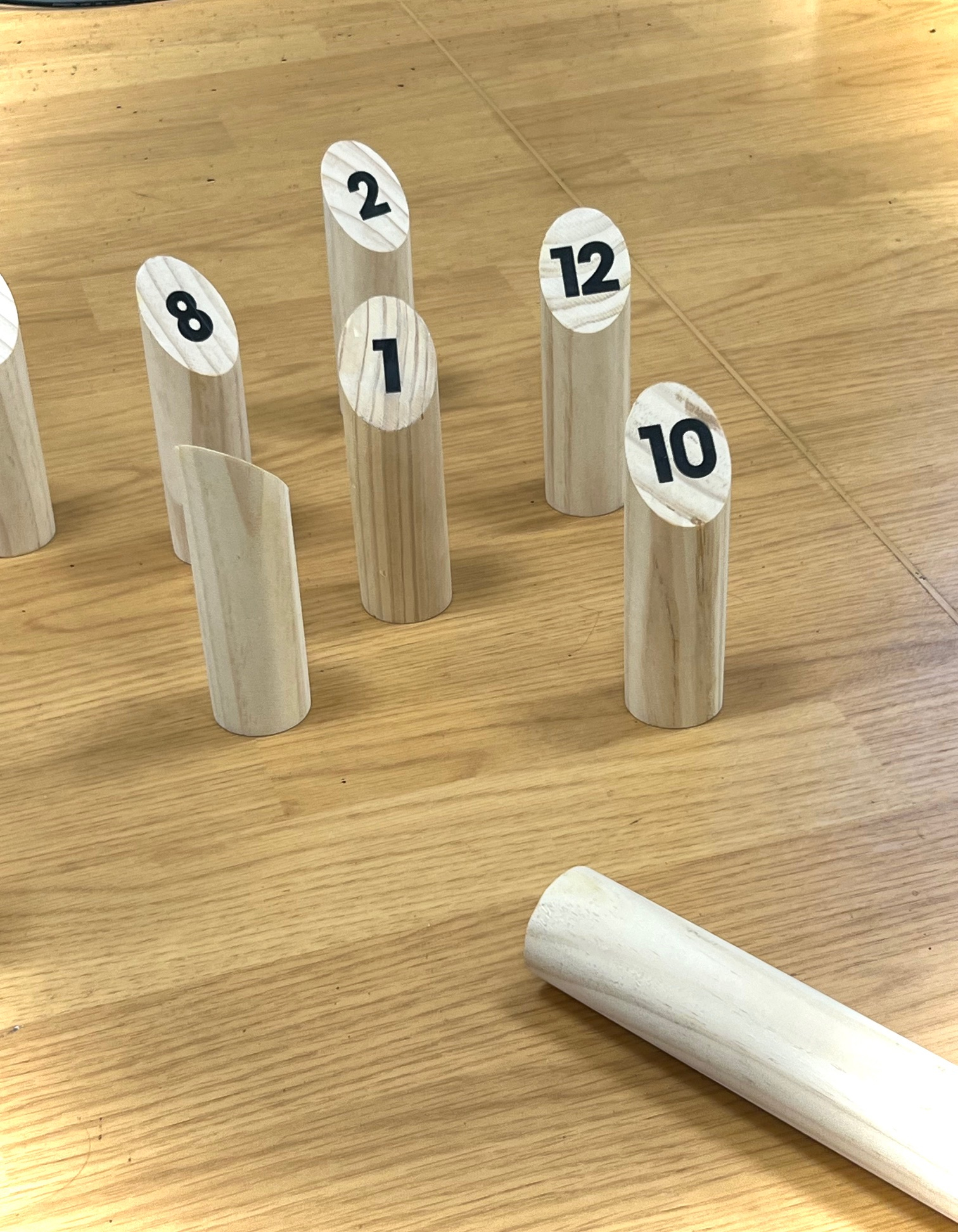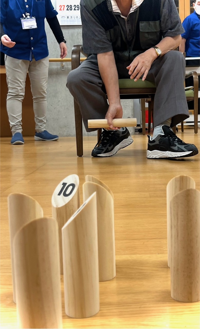 木製の投げる棒とピンがあり、その棒を下手投げで投げてピンを倒します。