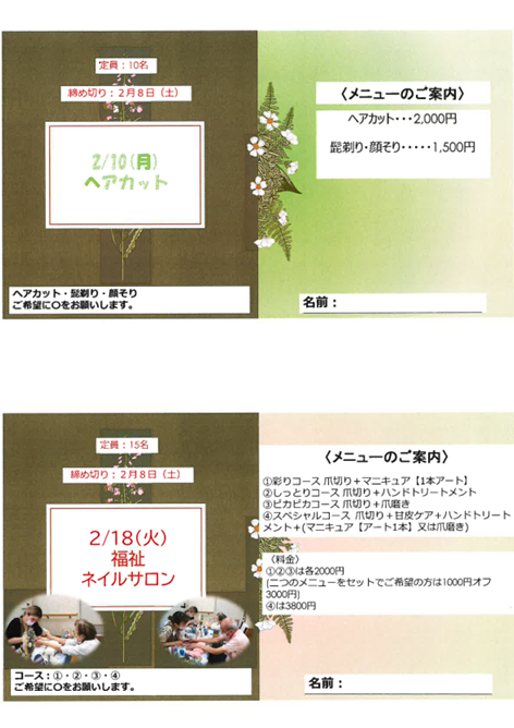 2025.02.01 お知らせ 2月の福祉ネイル・ヘアカット開催のお知らせ Tweet シェアする 今月のヘアカットは2月10日月曜日、 福祉ネイルは2月18日火曜日 に開催いたします。 臨時や振替でのご利用もご相談くださいませ。 つばめの里・本町東高齢者在宅サービスセンター M 前の記事 2025.02.01 お知らせ 2月の献立 次の記事 2025.01.28 お知らせ 昭和食堂へようこそーメニューブック- 一覧へ戻る