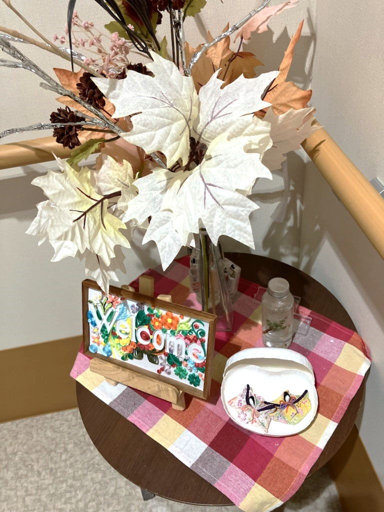 つばめの里デイサービスの入り口ではウエルカムボードと季節の装飾にてお出迎えしております。