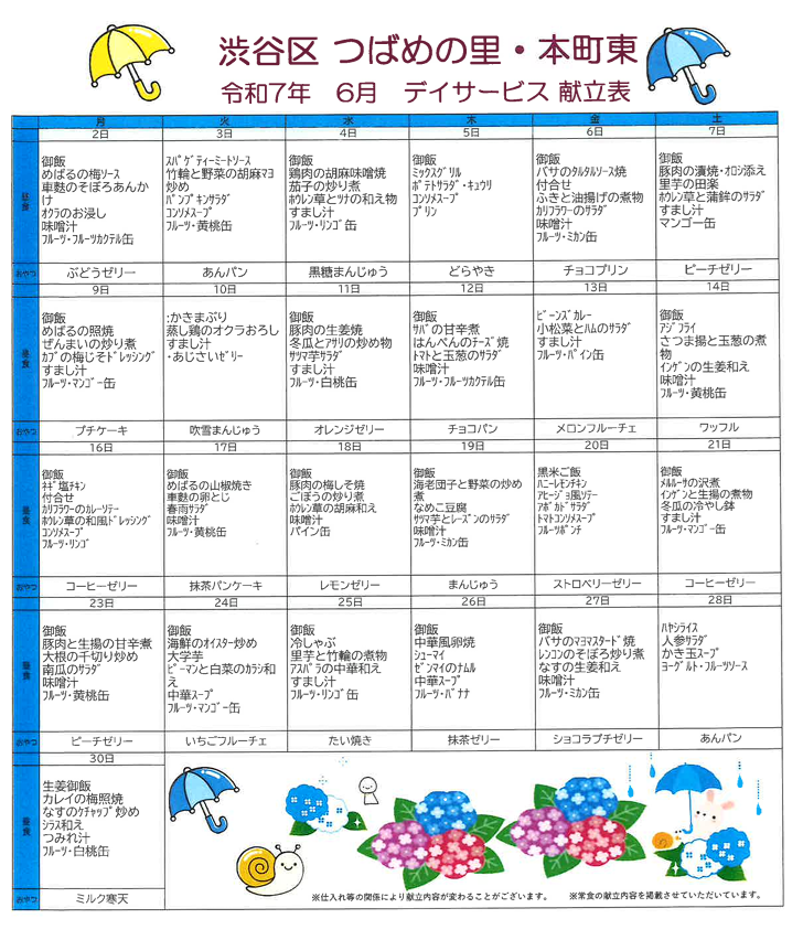 2025.06.02 お食事 6月の献立 Tweet シェアする 6月の献立をアップいたしました。 臨時や振替のご利用もご相談くださいませ。 渋谷区つばめの里・本町東高齢者在宅サービスセンター M 前の記事 2025.06.02 お食事 6月の福祉ネイル開催のお知らせ 次の記事 2025.05.31 お食事 心に響いたソロコンサート! 一覧へ戻る