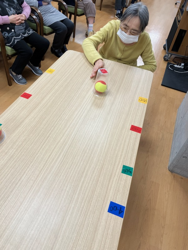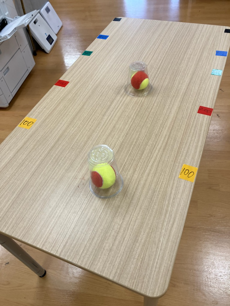 ルールは簡単!透明なカップの中にボールを入れ、テーブルから落ちないギリギリの所まで滑らせて止めるというゲームとなっております(#^.^#)